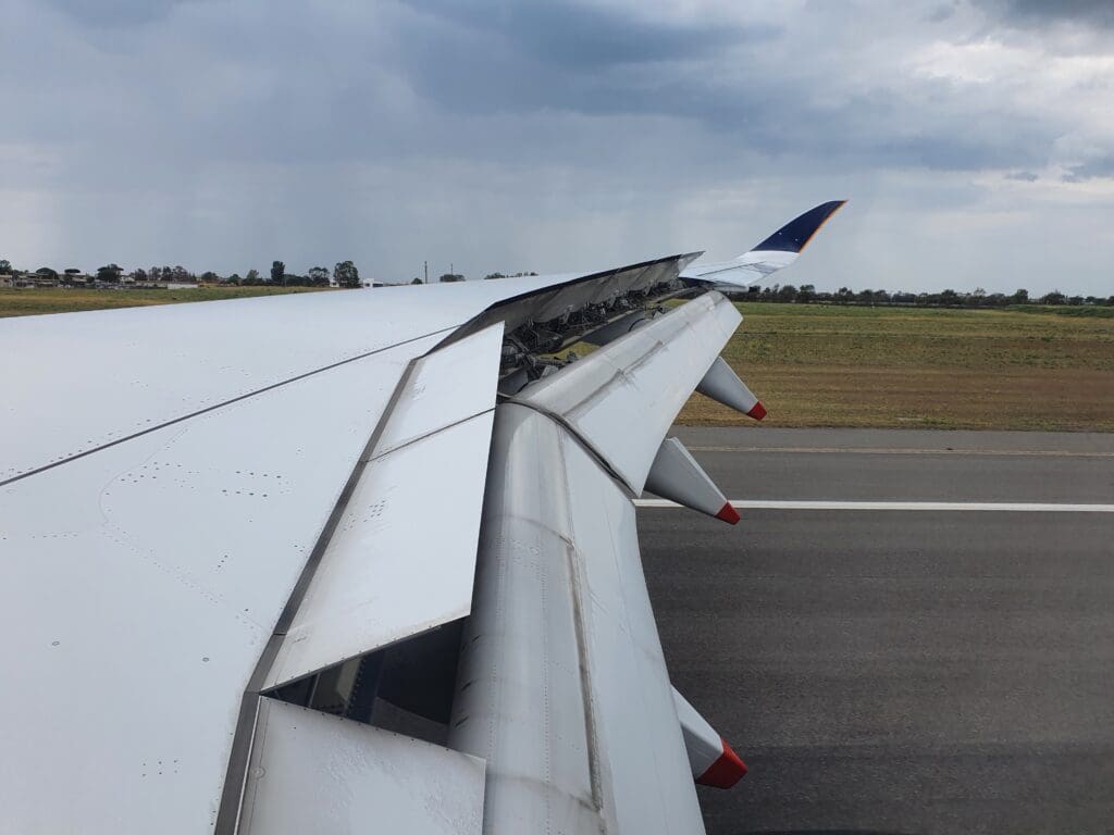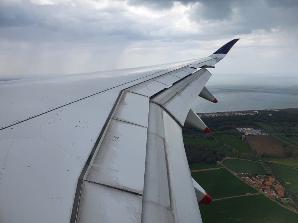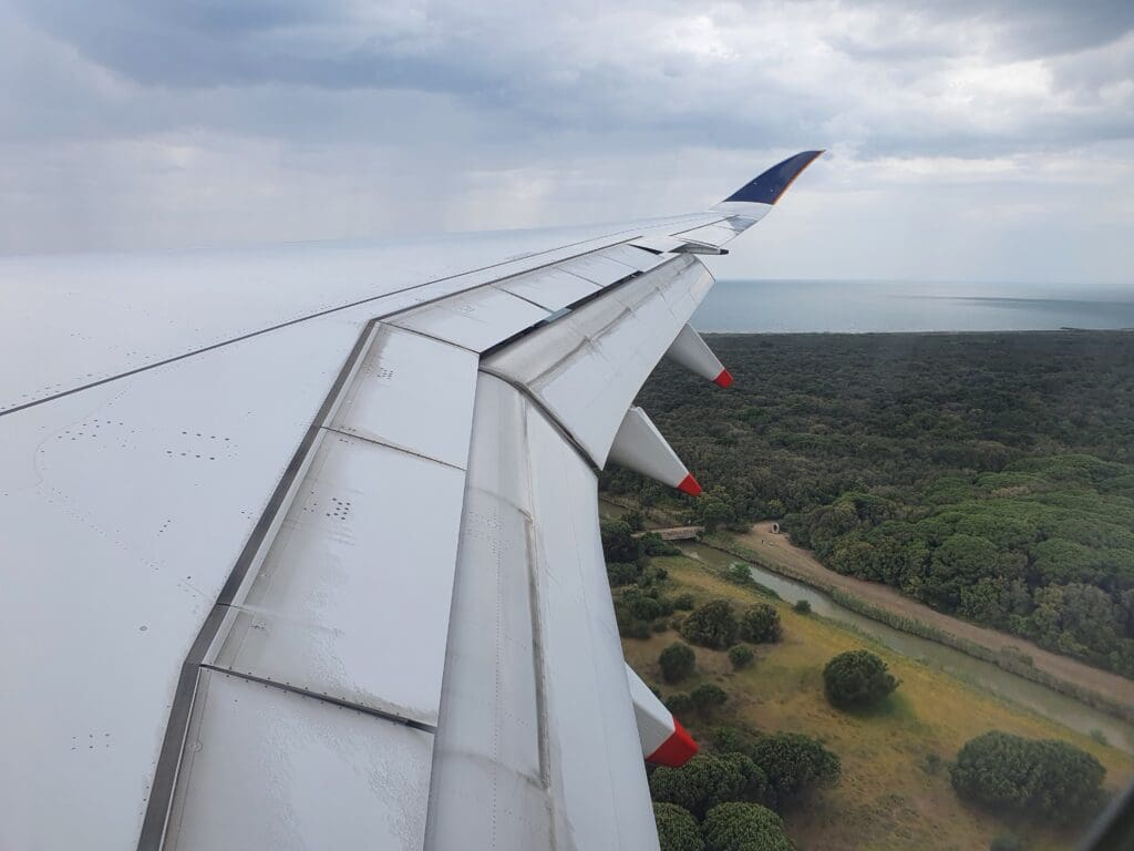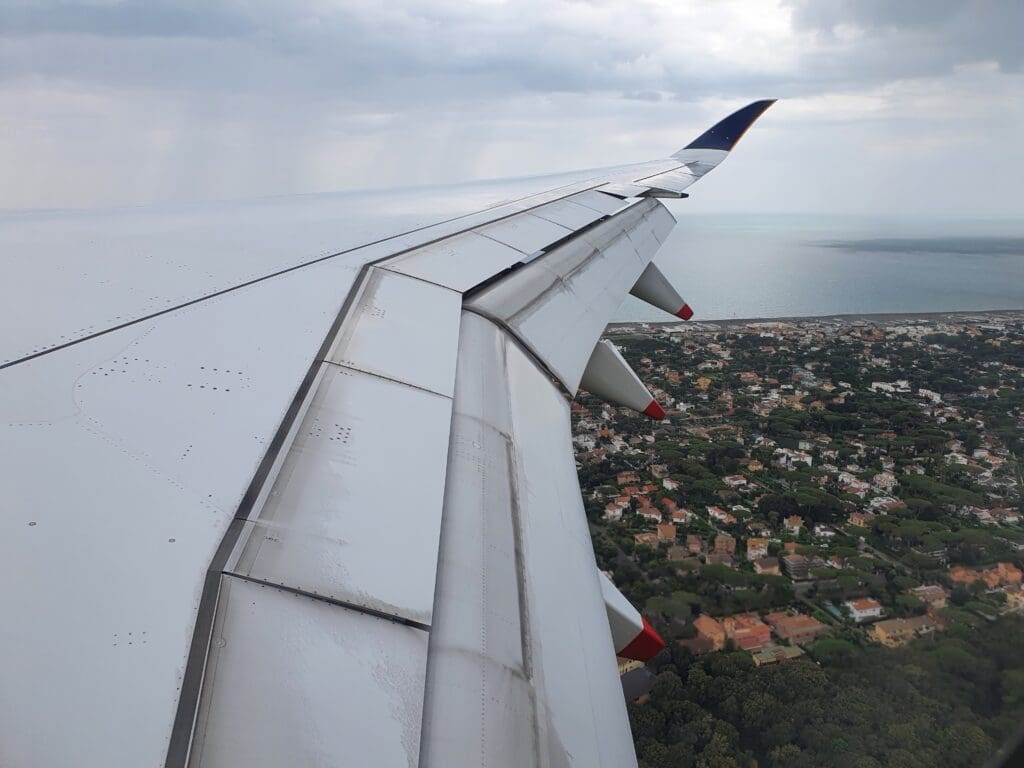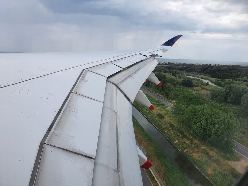 Several minutes of bumping later, the Airbus broke through the clouds at which point Lazio’s Mediterranean coastline came into view, with a mixture of forests and the villas and apartment blocks of the various towns that sit along this stretch of coastline whizzing past below. At 1406 the landing gear was extended below, resulting in plenty of noise and a few clunks before the aircraft passed over the seaside town of Fregenae. After darting over the airport’s perimeter fence, those sleeping would have likely been woken up as the aircraft touched down on Rome Fiumicino’s Runway 16R with a very firm bump at 1409, just under two hours after we departed from Copenhagen. Once safely back on the ground, likely seeking to minimise taxi time, the aircraft decelerated rapidly and soon vacated the runway to the left at which point the Purser welcomed all to Rome and apologised for the delay to our arrival.
