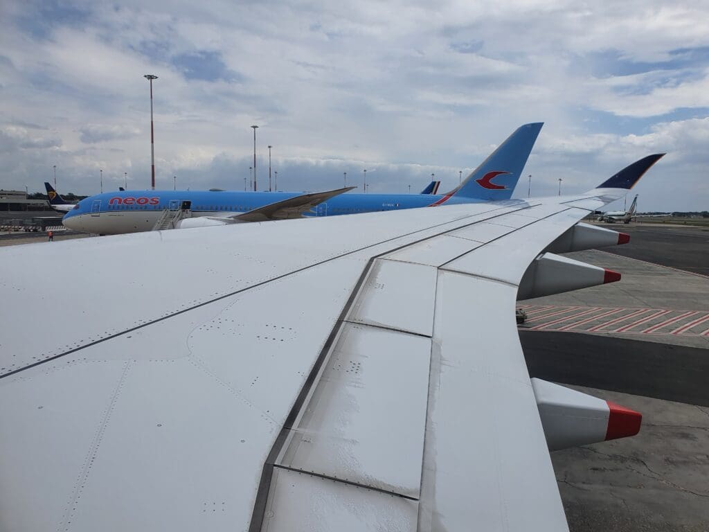 From the runway, a very short taxi was in store over to our remote stand where we pulled up to a bright blue Boeing 787-9 Dreamliner operated by local leisure carrier, Neos. Once the aircraft came to a halt, the engines spooled down and perhaps unsurprisingly given the fact that many had perhaps been travelling for a very long time, many passengers jumped up and appeared to be in a desperate rush to exit the aircraft. However, unfortunately for those passengers, upon our arrival, no buses could be seen and it took around ten minutes for buses to turn up and for disembarkation to commence. Eventually, the cabin door was opened and the jam in the aisle began to move at which point I picked up my small backpack and journeyed forward through the Economy cabin. As I headed through the aircraft on my way to the 2L door, after leaving Economy I first passed through the small three-row Premium Economy cabin which is home to recliner seats covered in a (faux?) dark grey leather arranged in a 2-4-2 configuration. In terms of design, these appeared to be fairly similar to what narrowbody Business class passengers may expect on flights outside of Europe. Next up was the smaller of the two Business Class cabins onboard, with this being home to sixteen comfortable-looking lie-flat seats arranged in a spacious 1-2-1 configuration, allowing all passengers to have direct aisle access. Some of these seats sported an elephant grey (faux?) leather covering, whilst others were covered in beige.