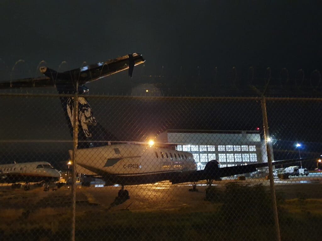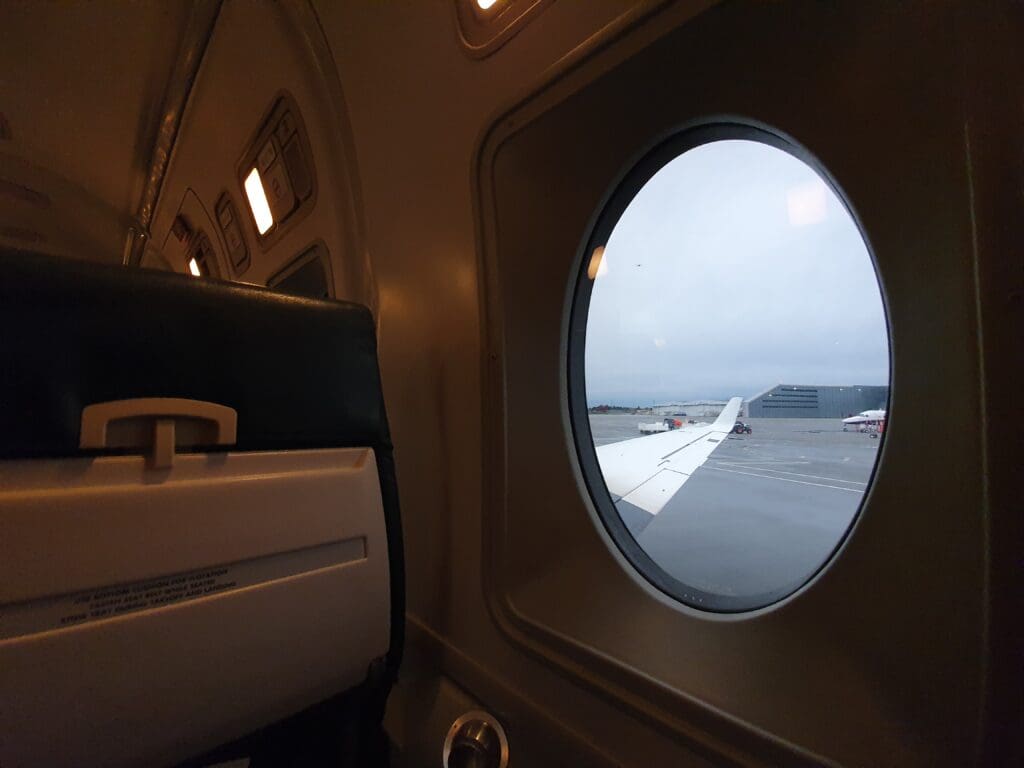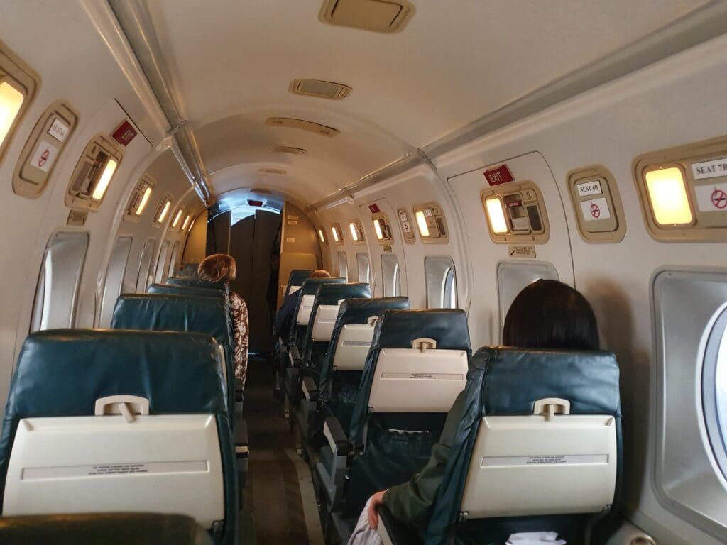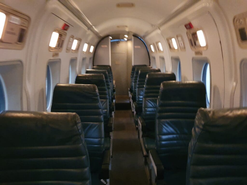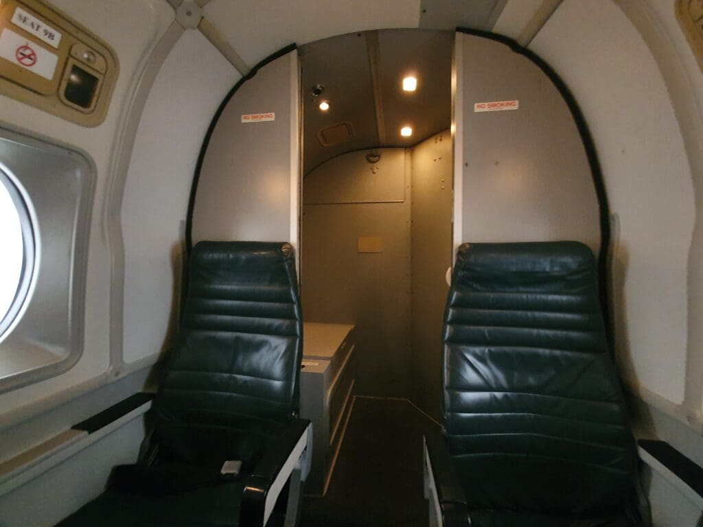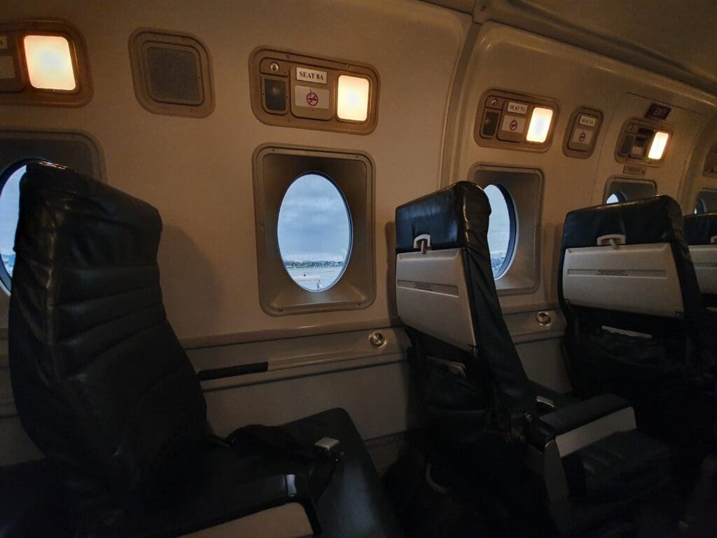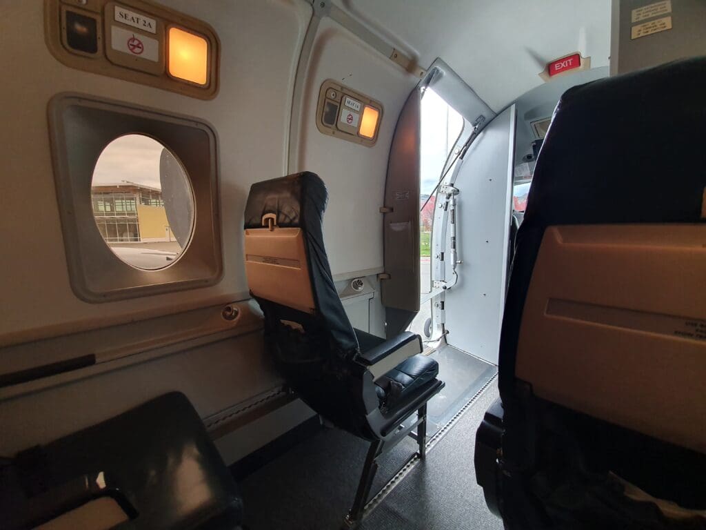 Upon arriving at the aircraft, I cautiously made my way up the six steps built into the inner side of the cabin door, admiring the four large Hartzell propeller blades before finding myself in the forward ‘galley’ area of the aircraft. Whilst some Beechcraft 1900 operators use this area for the storage of inflight beverages and snacks, Central Mountain Air does not offer any inflight refreshments on their Beechcraft-operated services. Therefore, onboard C-FCMN, a closet can be found at the front of the aircraft as well as several plastic storage boxes containing various bits and pieces such as toilet roll, air freshener and other equipment. Turning right, as expected, the cabin was narrow, however, the relatively tall ceiling of the Beechcraft 1900D made this feel slightly cavernous and more spacious than several other similarly sized airliners. This meant that I was able to make it down the cabin to my seat without having to bend over too much. With a total of sixteen large oval-shaped windows dotted about the fuselage, from the exterior one may conclude that the interior of the Beechcraft 1900 must be filled with plenty of natural light. However, these are permanently tinted and therefore the cabin was relatively dark, illuminated by the yellow tinge of the faint cabin lights located above each seat.
