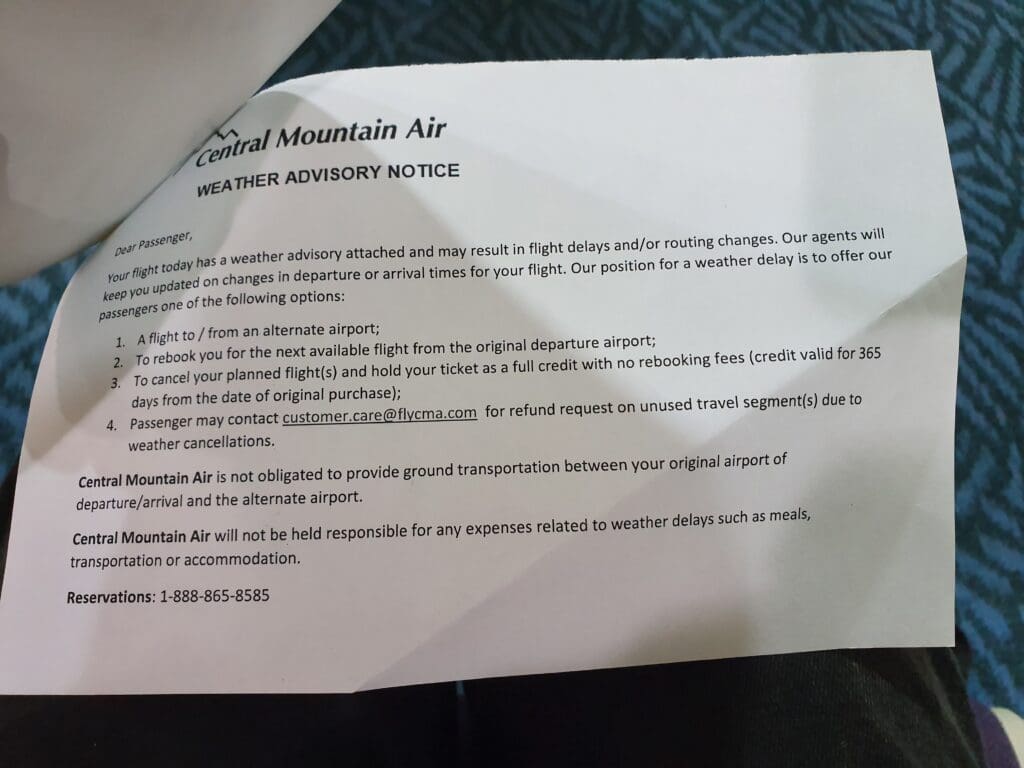 After handing over my passport and confirming my final destination, the friendly agent advised me that owing to low visibility in Prince George, a weather advisory was in place and that it may be necessary for the flight to divert to Williams Lake and was thus offered a refund were I not willing to take this risk. Given my evening flight back to Vancouver, my choice to reject the full credit refund and proceed ahead was risky, however, I could not come this far and not end up flying on a Beechcraft 1900! My two boarding passes were then printed out and handed over to me, with these stapled to a disclaimer that worryingly stated that Central Mountain Air would not be liable for providing ground transport from the alternate airport to the destination airport or for any expenses incurred as a result of a delay or diversion. Once I had received my boarding pass, I was informed that boarding would commence thirty minutes before departure through Gate 2 and advised to wait in the landside area until the security checkpoint opened up.