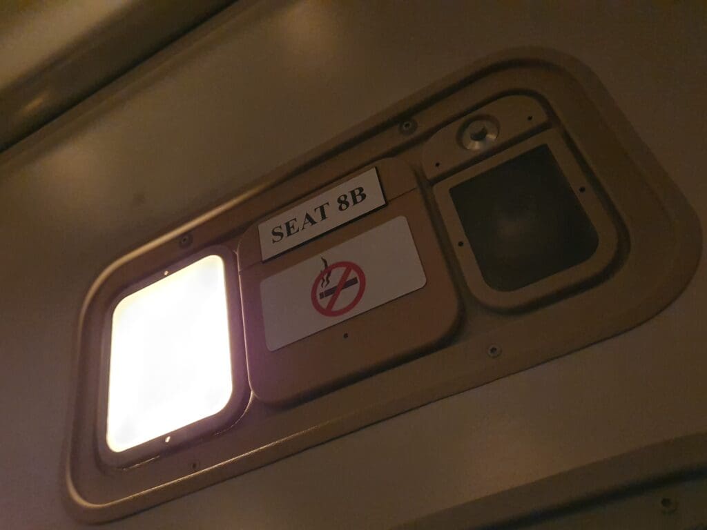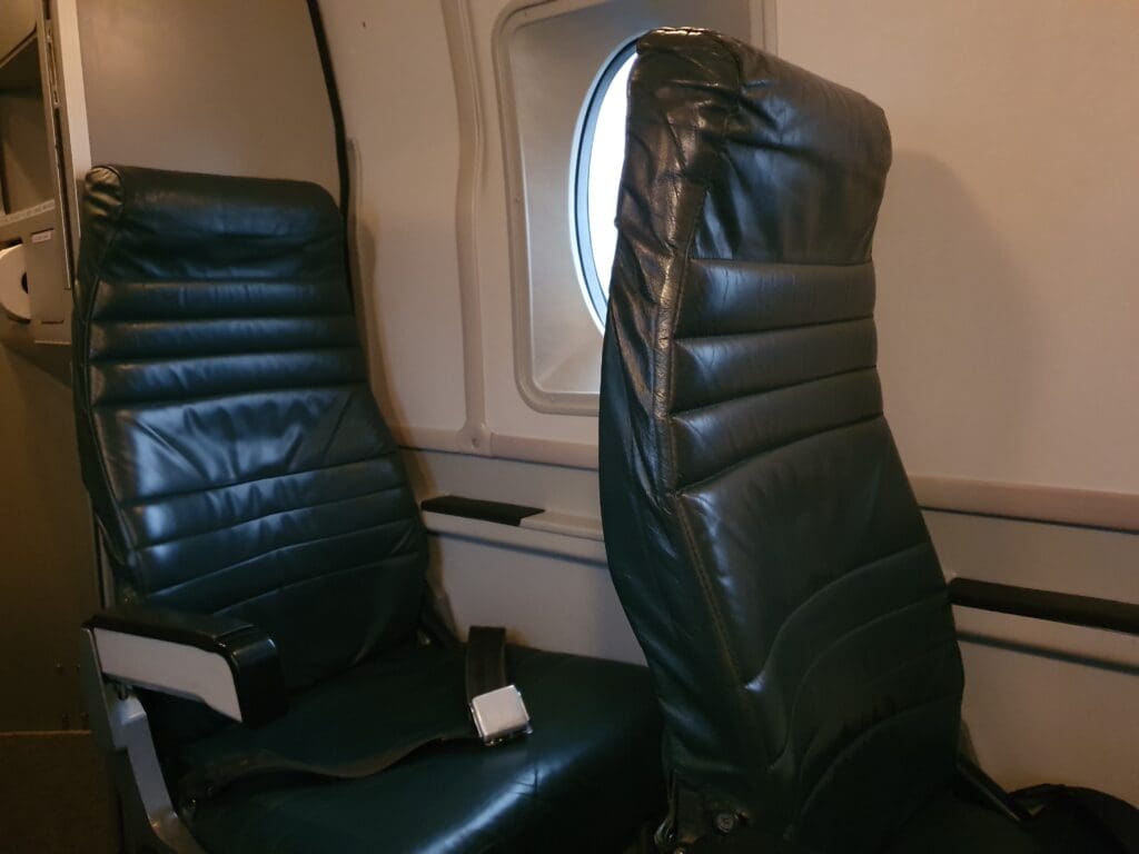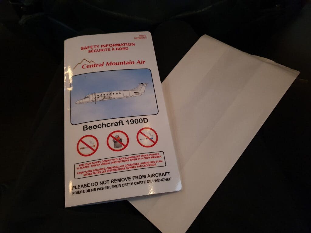 After passing the hump in the aisle as I crossed the wings, I soon arrived in the penultimate row, Row 8. Inside, C-FCMN features a total of eighteen seats, each of which is covered in dark green leather. Onboard, all passengers are provided with the luxury of an individual air vent located in the space beneath each window, whilst reading lights can be found above these. Whilst a good number of Beechcraft 1900 operators opt for additional cargo space and an extra middle seat at the rear of the cabin, Central Mountain Air’s Beechcraft fleet offer a small toilet at the rear of the cabin. Upon sitting down in Seat 8B, I was pleased to find that this was soft, comfortable, and as is not always the case on such a small airliner, offered a good amount of legroom. Whilst the seat cover appeared to have seen better days, all-in-all the cabin appeared to be in a surprisingly good state given the aircraft’s age and the rugged nature of operations undertaken by the Beechcraft 1900. Furthermore, as one ought to expect, the cabin appeared to be in spotless condition, with no signs of any rubbish or dirt anywhere around my seat. Turning to the seatback pockets, these contained a safety card and a plain sick bag.