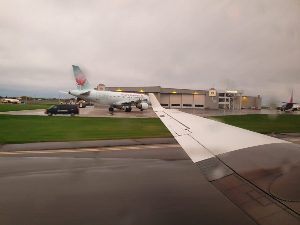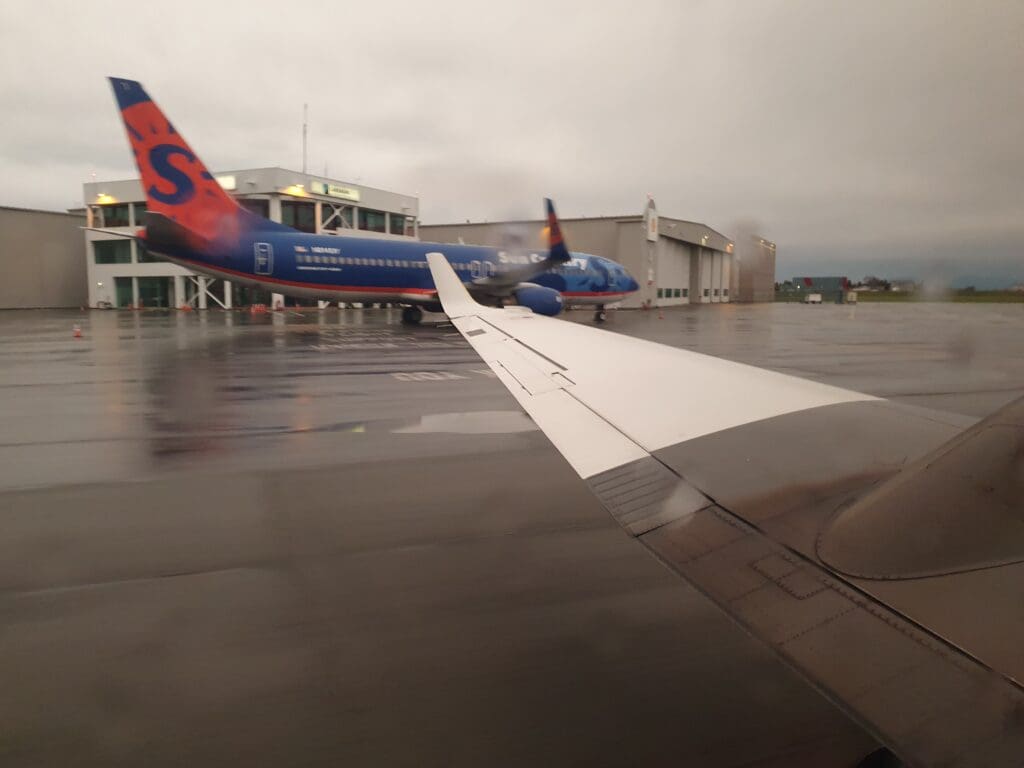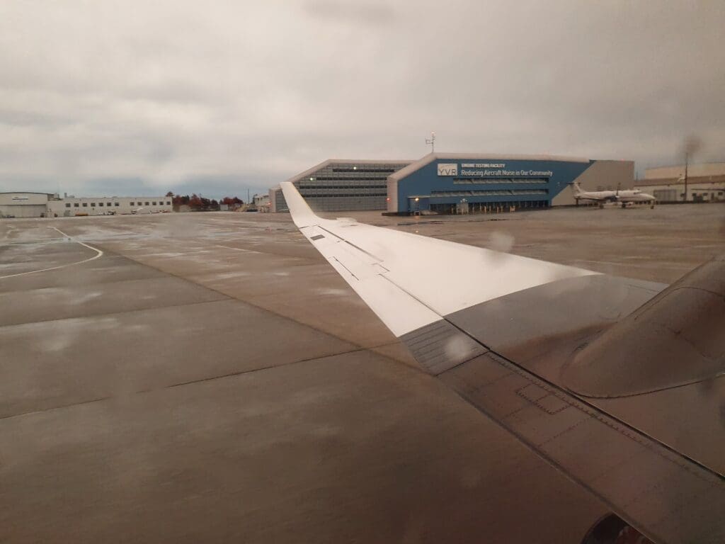 Almost as soon as the Captain’s welcome announcement came to a close, the Beechcraft’s two Pratt and Whitney Canada PT6A-67D turboprop engines spooled up and the propellers whirled into life. Seated almost as far away from the engines as possible, at first these did not seem to be too noisy however I expected my second leg in seat 2B to be slightly louder. As the engines spooled up, a pre-recorded safety announcement was broadcast over the cabin’s speakers. Alongside all the usual instructions and information, this also included a short mention of the location of the emergency locator transmitter (ELT) onboard the aircraft. Sixteen minutes behind schedule, at 0831, the Beechcraft lurched forward before immediately wheeling right and exiting the South Terminal’s apron. From there, the aircraft made its way along the taxiway to Runway 08R, travelling virtually parallel with the shoreline of Sea Island. During this journey, the Beechcraft passed an Air Canada Jetz Airbus A319, Air North Boeing 737-500, Summit Air Dash 8 Q300 and Sun Country Airlines Boeing 737-800 all parked outside the Signature Flight Support facility.