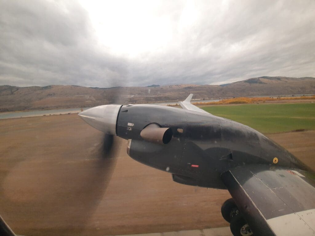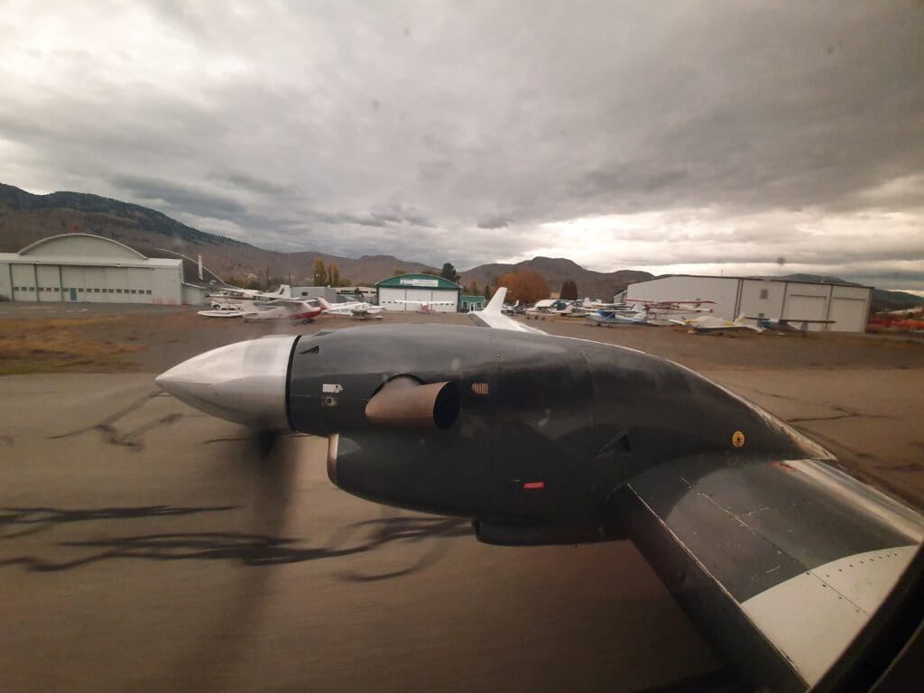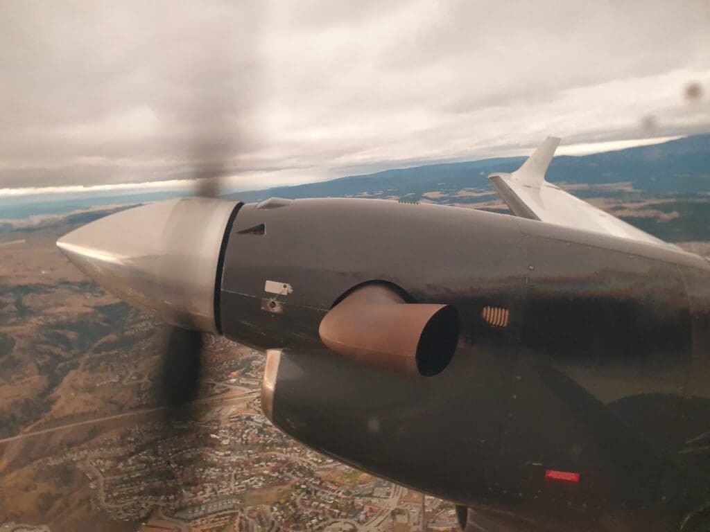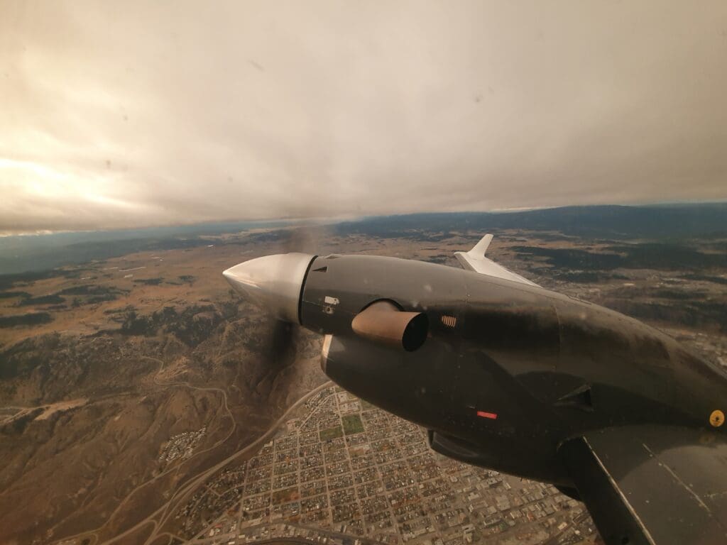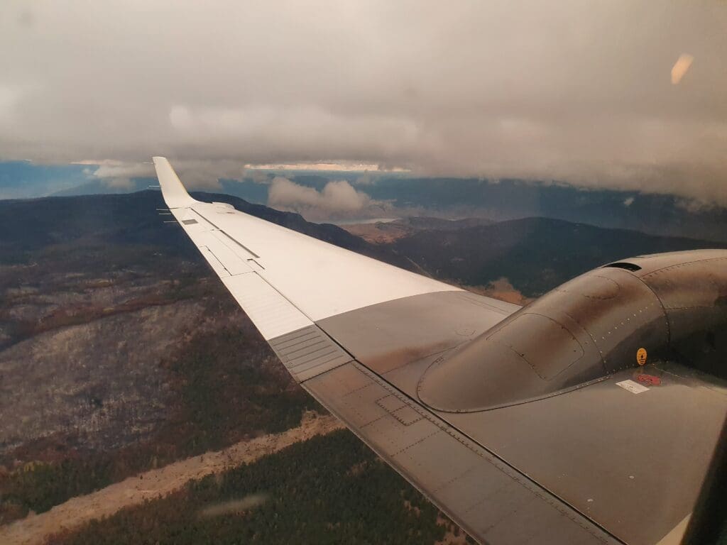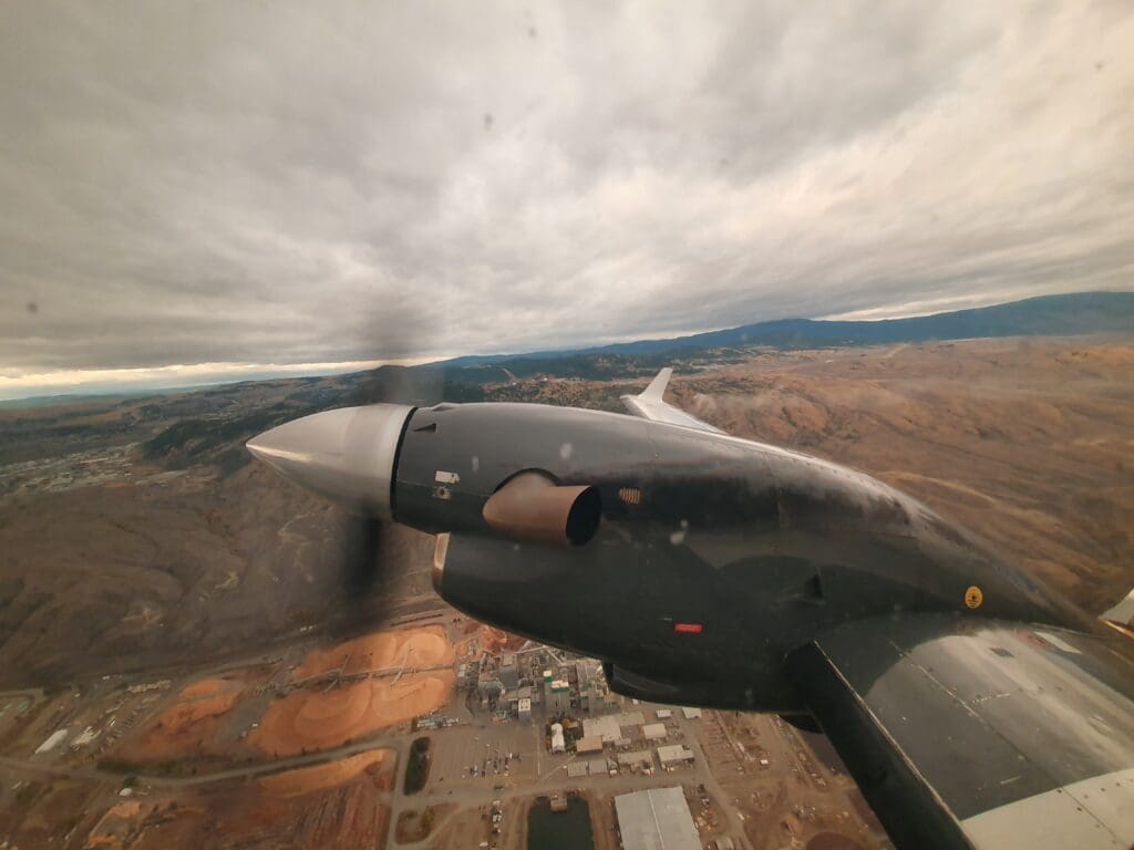 At 0949, the aircraft entered the runway and made a short taxi to the end of this before turning around. Despite this backtrack, at 8,000 feet long, Kamloops’ main runway is more than long enough for any small turboprop. In fact, once upon a time the airport was served by Pacific Western Airlines’ Boeing 737-200s, and more recently a Royal Canadian Air Force CC-150 Polaris (Airbus A310) visited following the tragic crash of a Snowbird CT-114 in the city in May 2020. Once pointing in the correct direction, the Beechcraft performed a rolling takeoff, with seat 2B offering a significantly higher level of noise and vibrations than 8A. Despite the higher load on this sector, once again the aircraft rocketed upwards in what seemed like no time at all with the hangars to the south of the runway soon coming into view before leaving the airport behind and heading over Kamloops Lake. In no time at all, the gear and flaps were retracted and almost immediately after departure, Kamloops’ large pump mill, operated by Domtar could be seen. From there, the aircraft climbed over the centre of Kamloops before turning onto a northerly heading and rising into the white clouds, eventually settling at a cruising altitude of 22,000 feet.