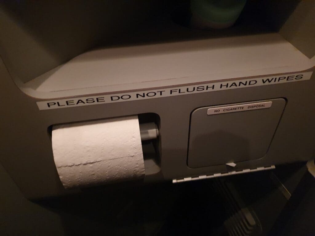 As the Captain had mentioned during their welcome announcement, the cruise that morning was relatively smooth – and whilst I failed to spot any seatbelt signs inside the cabin, I decided that a bathroom visit would be permitted at that time. Heading to the rear of the aircraft, receiving several suspicious looks from my fellow passengers as I did so, I soon arrived at the small toilet that separates the passenger cabin from the cargo compartment. Upon entering this, I slid the two plastic panels shut, and as these lack a lock, I ensured to do this correctly to prevent them from opening up mid-visit. Unlike the rest of the cabin, due to the curvature of the fuselage, I found it impossible to stand upright in the toilet, and as with many facilities onboard small airliners, this was relatively miniscule. Consisting of a toilet in a bench-style platform, toilet roll, wet wipes and a mirror, this was basic yet served its purpose and like the rest of the cabin appeared to be clean and tidy.