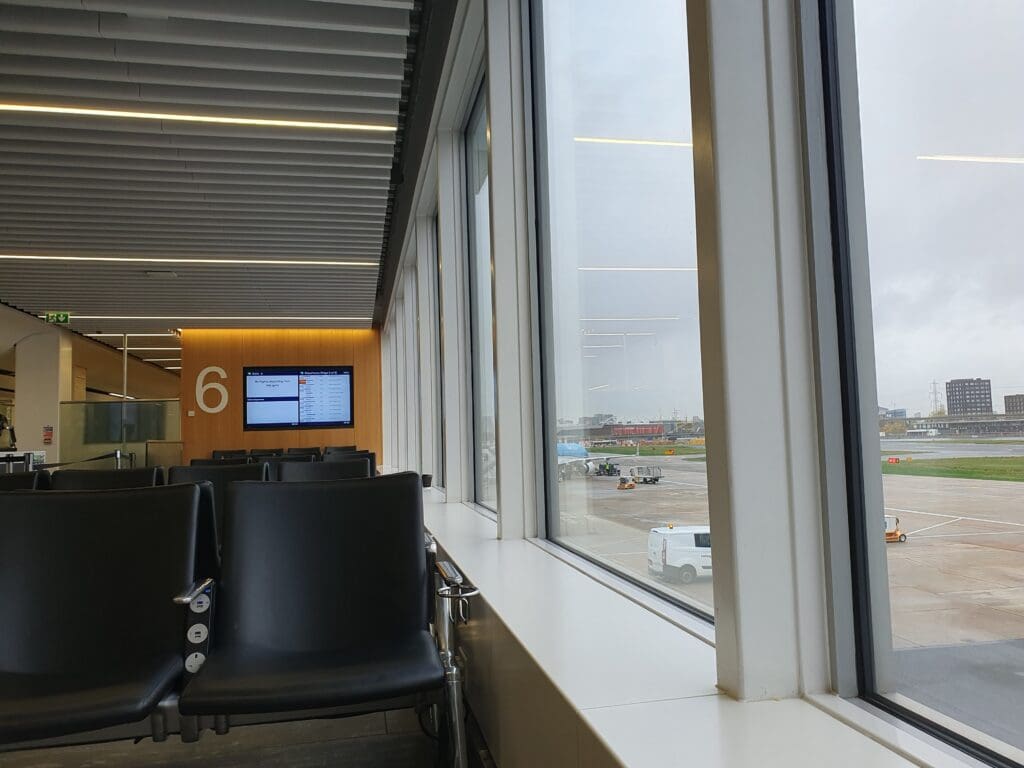 Eventually, I arrived in the airside area and walked through the terminal’s minuscule duty free shop before arriving in the main airside area. Given the fact that London City Airport is designed with minimal waits inside once airside, the terminal does lack the same array of facilities that some may expect to see at a busy international airport. Meanwhile, aesthetically, I found the terminal to bear more in common with a motorway service station rather than an airport terminal. Perhaps hoping to capture the demographic of joyful and sorrowful passengers in need of a drink after a long day’s work, three bars are on offer, alongside two cafés – Café Nero and another Pret-a-Manger. In addition to the small duty free store, three shops are available in the terminal – a Boots, an electronics store and a WHSmiths. In terms of design, the airport features a small, busy and viewless central hub as well as a long thin leg branching off this and running along the apron to the west. As I have found to be the case during my previous departures from the airport, that morning many passengers seemed to be waiting in the main portion of the terminal and thus this seemed to be rather crowded with few spaces remaining available to sit and wait. Following a quick stop at a filthy set of toilets in the main waiting area – finding half of these were blocked and nearly overflowing, I made my way down the terminal’s ‘leg’ where I was pleased to find plenty of seats remaining available. As many expect to see in 2022, I found the terminal to be home to a good number of plug sockets and charging points as well as fast complimentary wifi which worked well throughout the terminal for the duration of my stay.