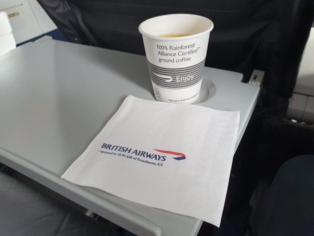 A short time after leaving Ilford behind, the Dornier continued its climb over London’s northeastern fringes as we journeyed from Greater London and out into the wilds of Essex. At this time a loud ding rang out indicating that the flight attendant was free to leave their jumpseat at the front of the aircraft and move about the cabin. Making their way to the rear of the aircraft, they soon poured out passengers’ drinks of choice and within a few moments I was handed an orange juice in a British Airways branded paper cup and a British Airways/Sun-Air branded serviette. Turning my attention back to the world outside, as we climbed gaps in the clouds revealed the busy M25 motorway before we passed over the Essex town of Brentwood and turned on to a northeasterly heading that would take us towards Denmark. From there, a good view of the green Essex countryside could be had, as well as Hanningfield Reservoir followed by Maldon and the River Blackwater Estuary before the aircraft rose up into the clouds for good, taking away all remaining views of the flat Anglian landscape below.