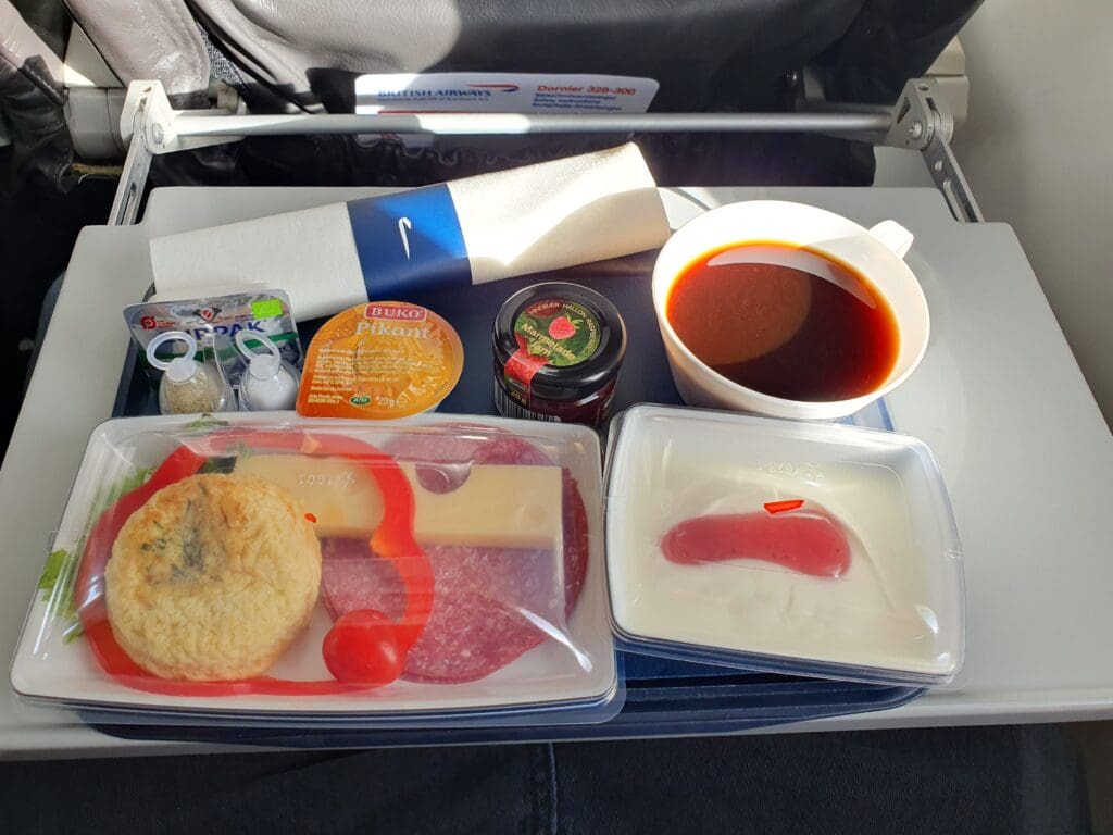 That morning I was treated to a hearty continental breakfast – provided with a main dish containing several pieces of salami and a block of mild cheese, a red pepper and a single cherry tomato, as well as a spinach and egg souffle/tartlet. For dessert, I had been provided with a yoghurt with a hint of fruit puree. To accompany these, individual salt and pepper shakers were provided, as well as small tubs of Lurpak and a cheese spread, and a small glass jar containing raspberry jam. In addition, I was provided with real British Airways branded metal cutlery neatly rolled up in a serviette. Whilst I had been expecting this offering, I was nevertheless highly impressed with this delightful and filling breakfast offering and found this to be more akin to a Club Europe meal rather than a Euro Traveller one!