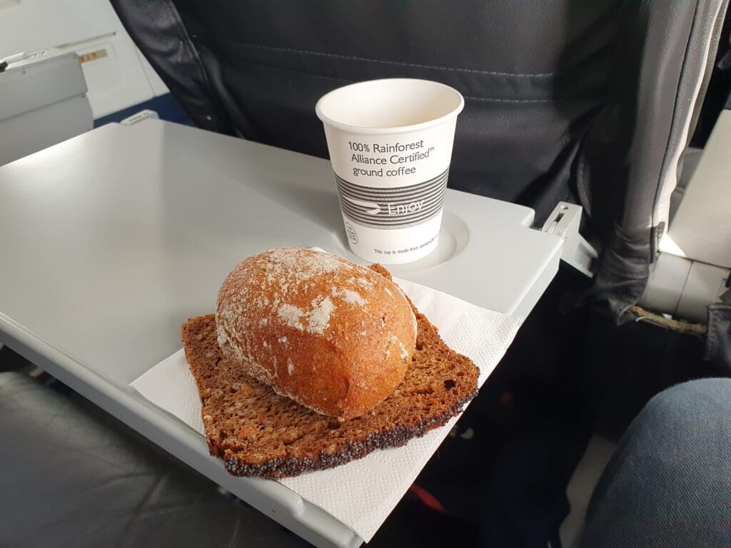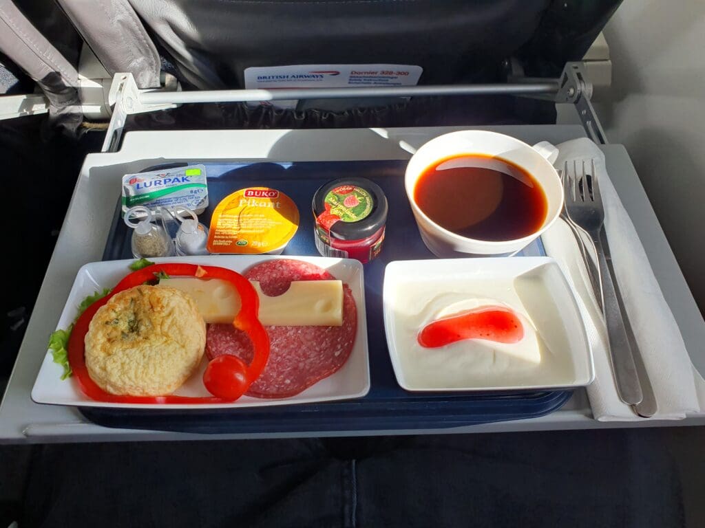 At 0958 the seatbelt signs were extinguished just before the Dornier broke free from the clouds and blue sky appeared above. Wasting no time, the flight attendant soon rolled out a small trolley to the front of the cabin and commenced the main round of inflight service. As mentioned, Sun-Air offers passengers a full meal on all of their services, with this service often compared to Club Europe (Business) service onboard mainline British Airways’ short haul flights and is known for far exceeding the complimentary Euro Traveller offerings. Given the very light load, in spite of the fact that the flight attendant took their time to interact with passengers and ensure that they had everything they needed, it didn’t take long until they reached my row at the rear of the aircraft. To start, a small tray fully laden with items was passed over and placed on my tray table before I was asked whether I would like tea or coffee. Opting for the latter, this was poured into my plastic mug and cautiously passed back over to me. Next up was bread, with the flight attendant presenting a basket full of rye bread slices and brown bread rolls. Initially opting to go just for a rye bread, I was then convinced to have a bread roll too! These were both placed on a serviette on the neighbouring tray table before our interaction was over and the flight attendant made their way back to the rear galley.