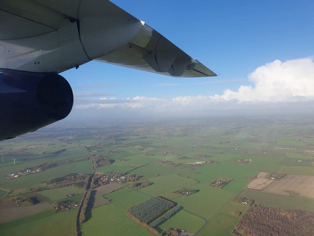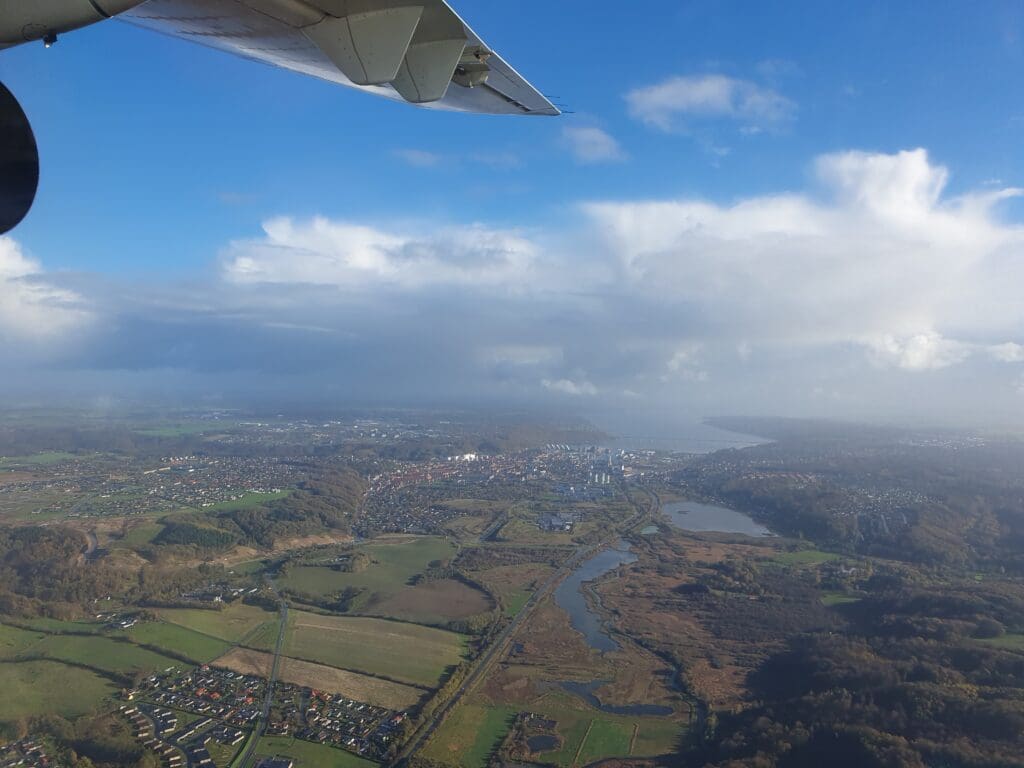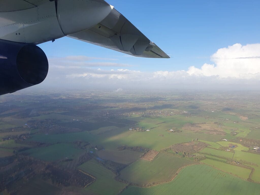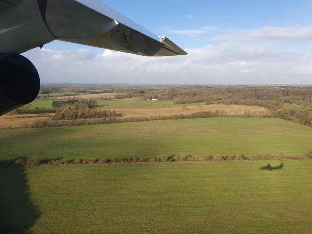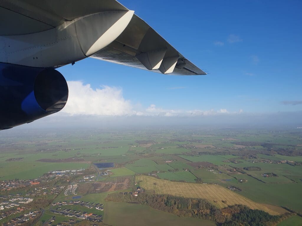 Looking outside, it wasn’t long before the aircraft sank below the clouds and Jutland’s mostly flat rural landscape of lush green fields and forests appeared below. That lunchtime, the aircraft crossed almost the entirety of Jutland from west to east before turning back towards Billund just after reaching the small city of Vejle which sits on Jutland’s eastern coastline. After turning towards Billund, the flaps were soon extended followed by the gear, as the green fields and forests below along with the occasional farm and village became increasingly clearer as we neared Billund Airport.