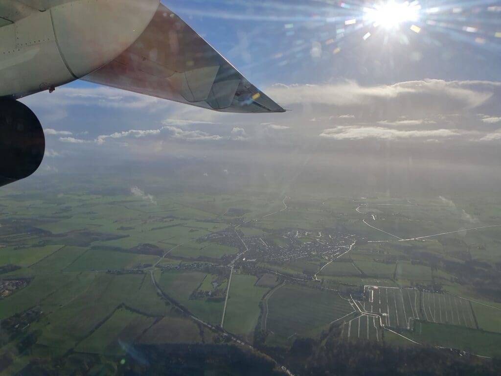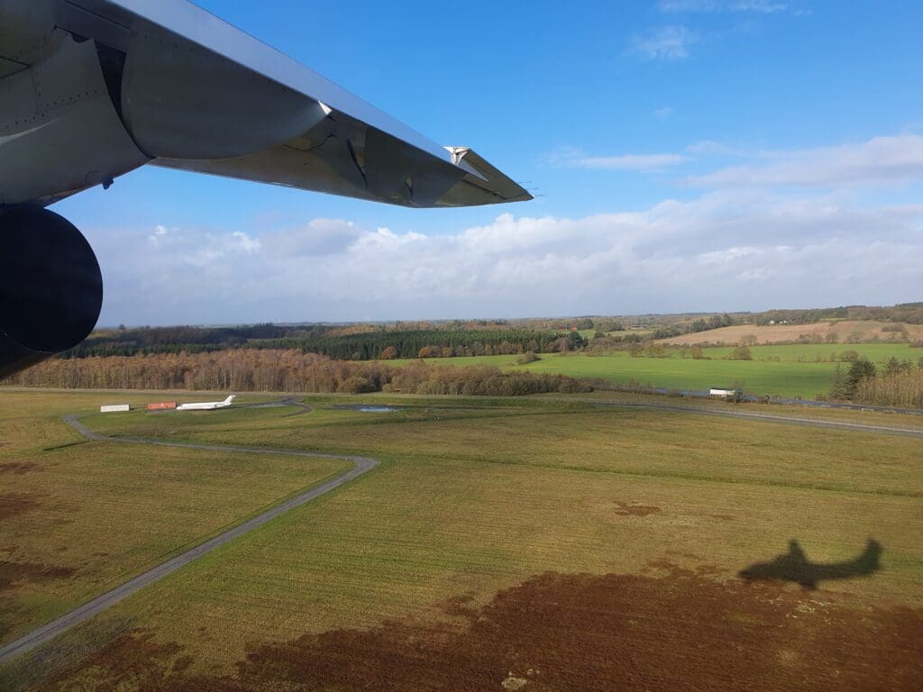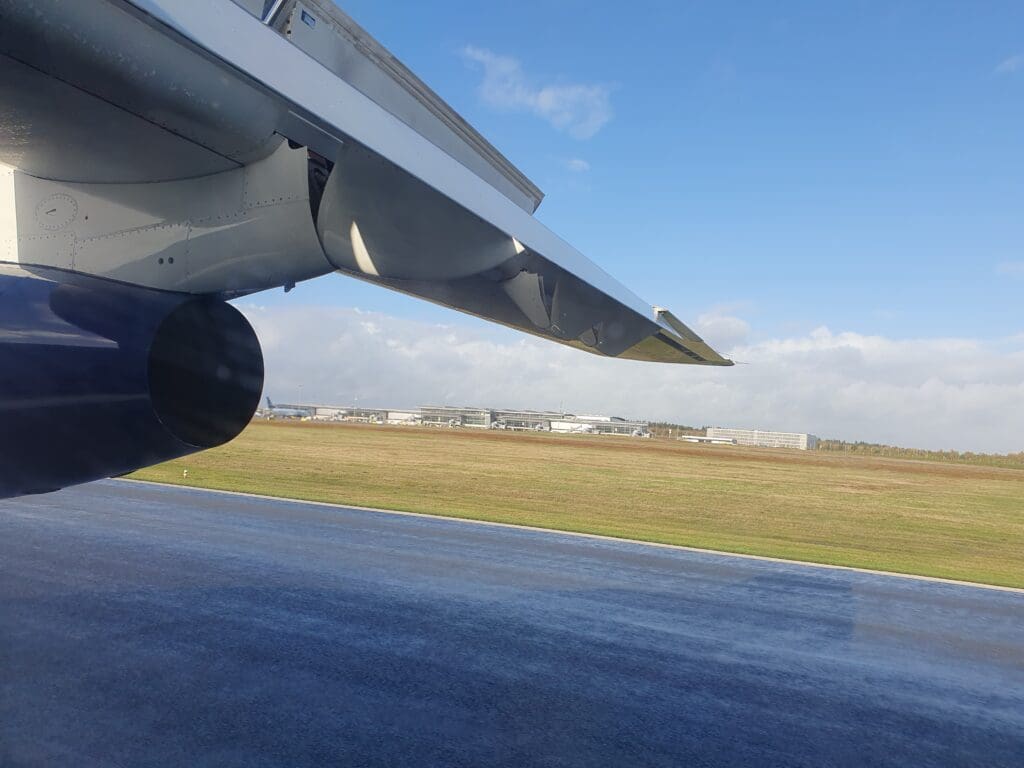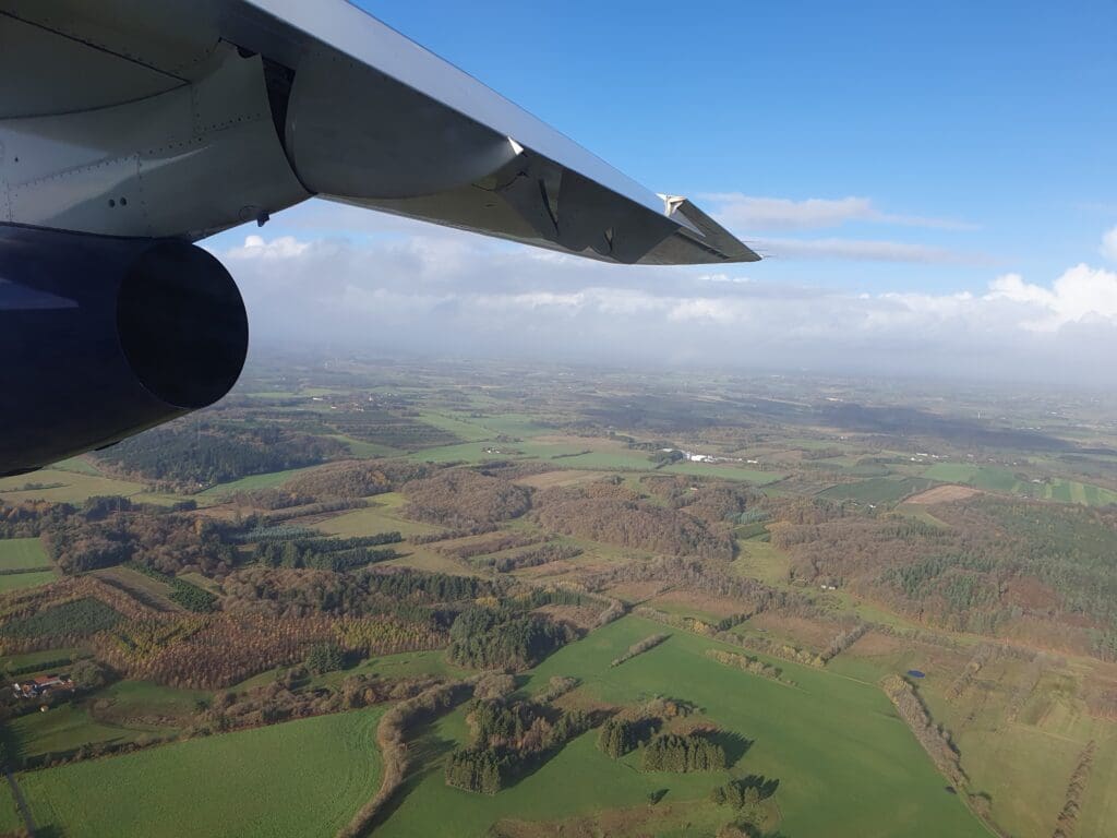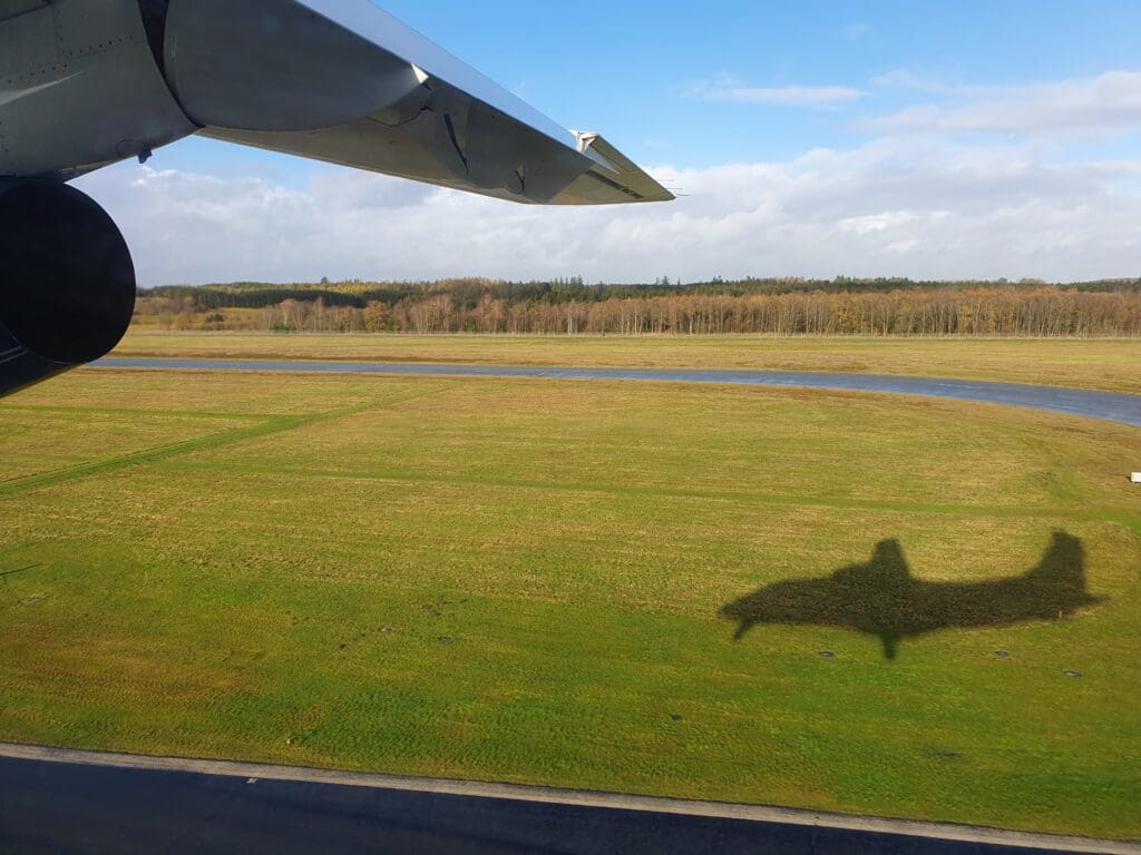 Looking outside, it wasn’t long before the aircraft sank below the clouds and Jutland’s mostly flat rural landscape of lush green fields and forests appeared below. That lunchtime, the aircraft crossed almost the entirety of Jutland from west to east before turning back towards Billund just after reaching the small city of Vejle which sits on Jutland’s eastern coastline. After turning towards Billund, the flaps were soon extended followed by the gear, as the green fields and forests below along with the occasional farm and village became increasingly clearer as we neared Billund Airport.