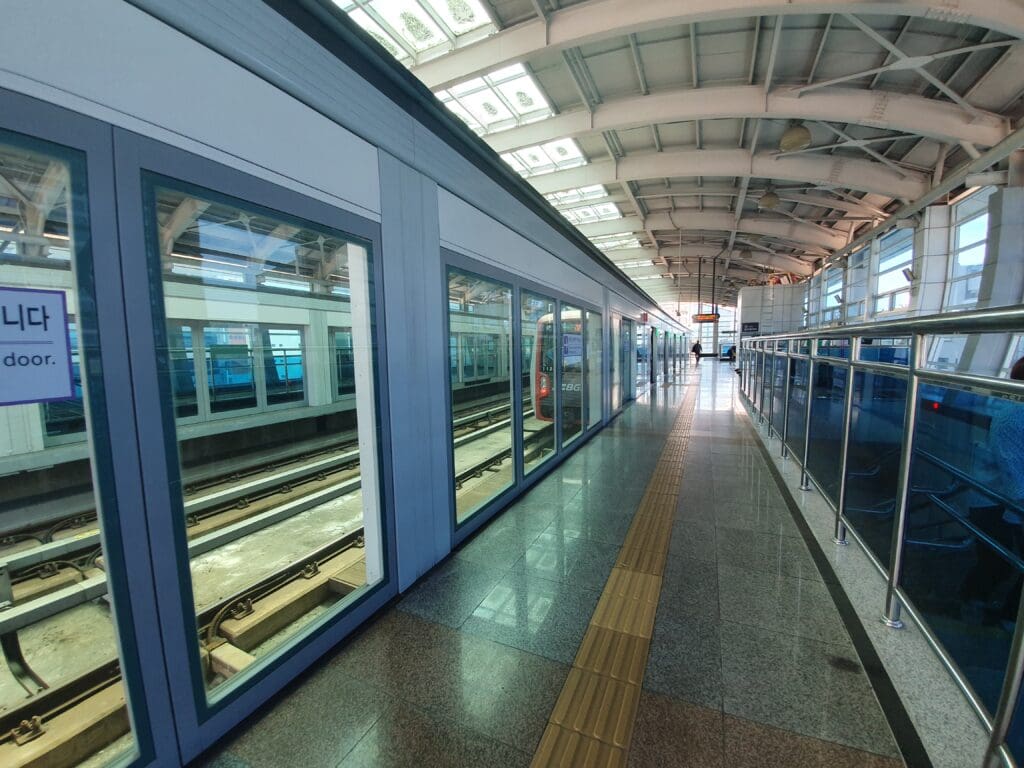After stopping for a coffee, having a decent wander around and a spot of light lunch in the form of a convenience store dosirak, it was time to head over to Gimhae Airport. Whilst a direct bus service from Nampo to the airport exists, this is a local bus and so seats are not guaranteed, plus making plenty of stops, this takes around an hour. Seeing as I was carrying a suitcase, I opted to take the quicker albeit less geographically direct metro option. Thus, after collecting my suitcase, at around 1400 I stepped onto a crowded yet spotlessly clean and well air-conditioned vintage Line 1 train dating back to the 1980s. After riding a small fraction of the 40.5 kilometre line the train pulled into Seomyeon Station where I transferred onto a Line 2 service bound for the city of Yangsan. However, in order to reach the airport, one final transfer was needed, this taking place in Sasang where I headed above ground and boarded a driverless Busan-Gimhae Light Rail train. At 1445, several short minutes after leaving Sasang, the train pulled into Busan Gimhae Airport’s dedicated station and like many onboard, I disembarked and took the escalators down to the ground floor level.