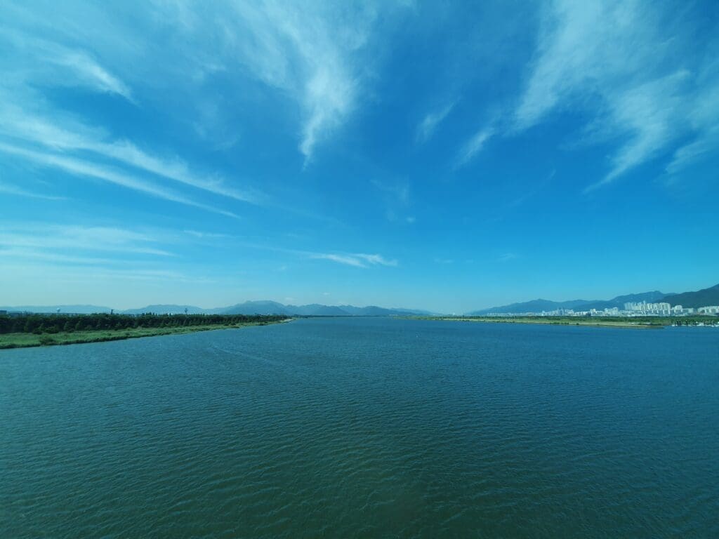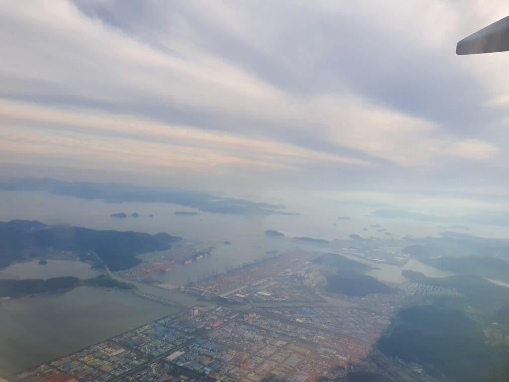 As the Boeing 737 powered away from Gimhae Airport, making a steep climb over the Nakdong River estuary, good views of the Sasang and Hadan areas of Busan could be had before the aircraft gently commenced a 180 degree turn to put us on course for Seoul. As we banked, the world’s sixth busiest cargo port came into view followed by the cities of Changwon and Gimhae alongside a collection of mountains, industrial areas and farmland. Around ten minutes after leaving the airport, a small portion of Korea’s fourth largest city, Daegu, could be seen below which was followed by the small city of Gumi. The latter is somewhat historically significant being the hometown of Korea’s controversial dictator Park Chung-hee, and his daughter, impeached former president Park Geun-hye.