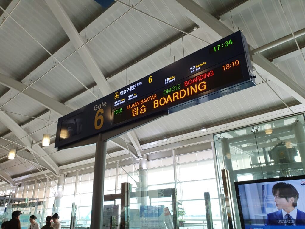 After a ten minute wait, I arrived at one of the desks and was warmly greeted by the agent. After some typing, my passport and Mongolian visa were checked before a Korean Air branded boarding pass and baggage tag were printed off. After the gate and boarding time were circled in the usual manner, I was advised that boarding would be undertaken via a bus before being sent on my way. Following a brief stop at a spotlessly clean toilet block, I headed through to security and immigration. Thanks to the efficient staff and the fact that I was not carrying any significant electronic items or liquids in my bag, I was able to pass through the security check within a couple of minutes. However, seeing as only two out of the ten immigration desks reserved for those with foreign passports were manned, officially exiting Korea took a little longer to do. This served to be the exact opposite of Seoul Incheon Airport where I find security can take longer to pass through than immigration. That said, seeing as I made it to the airside area in a little under 25 minutes after joining the check-in queue, I am not entirely qualified to complain about waiting.