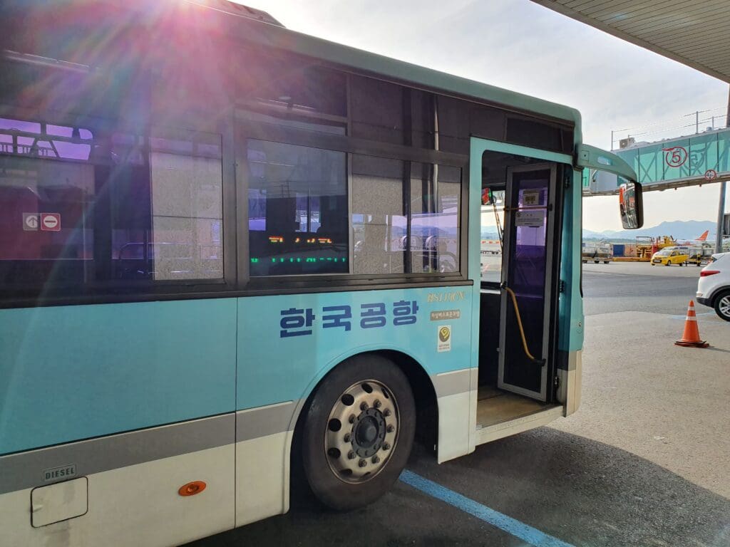 After a long walk around the rectangular terminal, at 1725 I headed over to Gate 6 which is located in the middle of the twelve-gate terminal. True to neither the boarding time given on my boarding pass, nor the information given on the departure boards, boarding commenced at 1730. At this time, I joined the short queue of eager passengers and soon had my boarding pass scanned and passport checked before I was allowed to head down the stairs and onto the waiting Air Korea bus. Whilst many airlines and handling companies enjoy squeezing as many passengers as is physically possible onto buses, that day this proved not to be the case. With a seemingly constant shuttle of buses heading to and from the aircraft, the bus doors slid shut with a fair few vacant seats and we soon headed off. Upon pulling away from the terminal, the bus headed down the relatively empty flight line. During this journey, we passed two modern aircraft both being prepared for the 140-mile hop down to Fukuoka- a sharklet-equipped Air Busan Airbus A321 and a Korean Air Airbus A220-300.