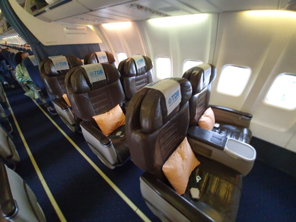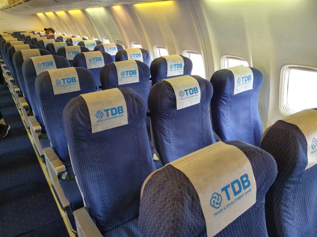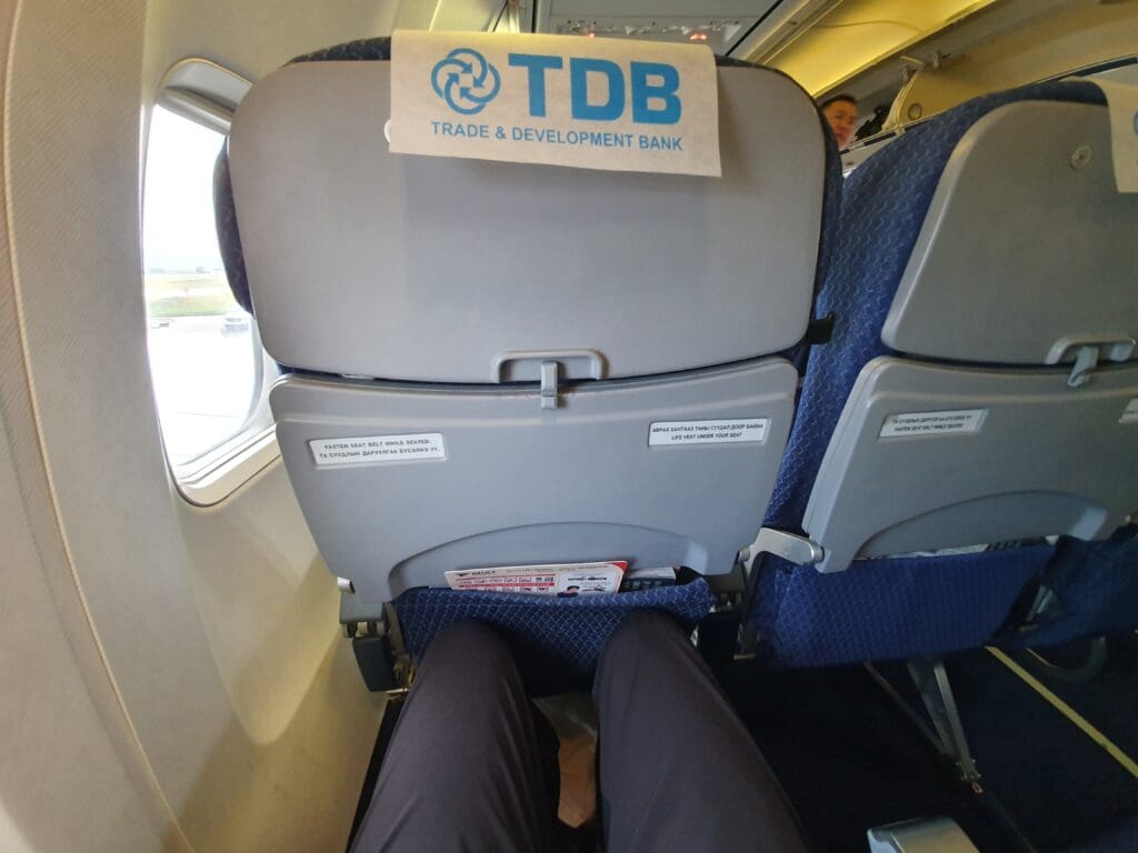 Upon entering the forward galley I was given a lukewarm greeting by two of the flight’s five strong cabin crew members. With only one way to go, I soon turned right into the aircraft’s business class cabin where I was greeted by classical music and the sight of three rows of very comfortable old school leather covered seats in a 2-2 configuration. All bar one of which was empty, with one seat being occupied by a tough-looking reflective jacket-wearing crew member who I assumed to be a mechanic or a security guard. Within seconds I arrived in the aircraft’s large economy cabin where mismatched orange-yellow lighting illuminated the 162 seats in front of me. All of these were covered in blue fabric featuring a repeating pattern and sported a disposable fabric headrest cover which featured an advertisement for Mongolia’s Trade and Development Bank. Seeing as the cabin was almost entirely empty at that time, I made it to my Seat 23A in no time and soon made myself comfortable.