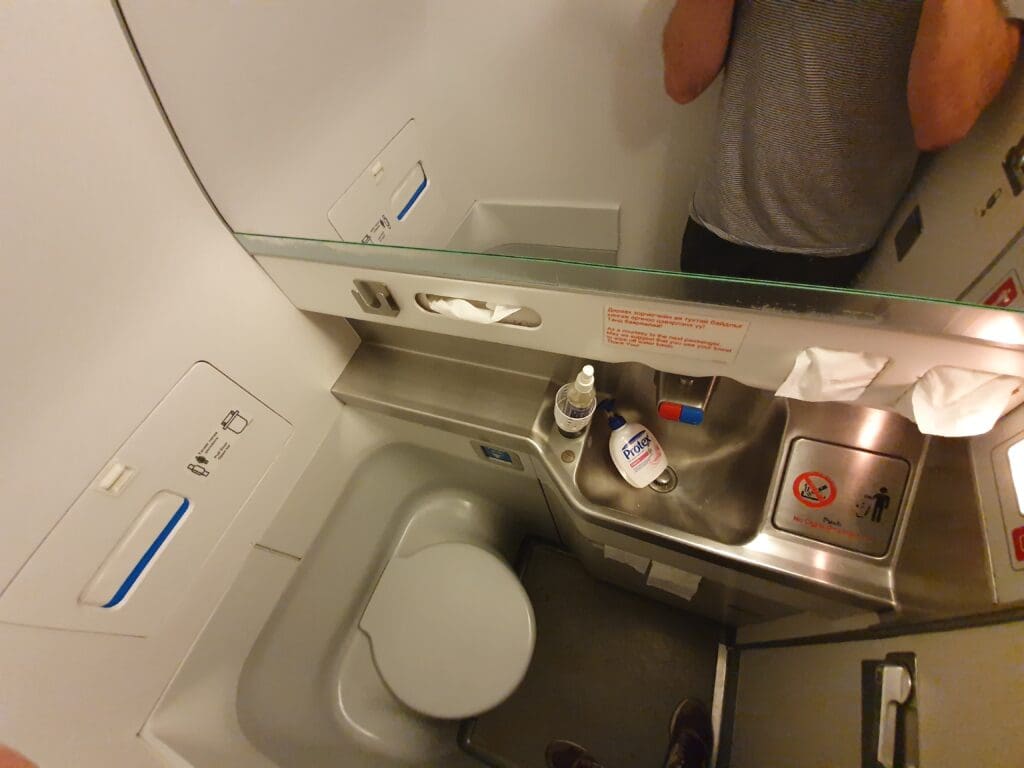 Once I had exhausted the inflight entertainment options, I was pleased to see that the clouds beneath the aircraft had begun to break up offering glimpses of the remote and sandy coloured landscapes of northern Hebei and Inner Mongolia. Meanwhile, almost an entire hour after the dinner service commenced the cabin crew passed through the cabin collecting trays from the front and middle thirds of the economy class section of the aircraft before retreating to the rear galley. Perhaps convinced that the crew would not return, my two seatmates who were travelling as part of the large church group proceeded to take matters into their own hands and carry their trays to the rear galley. Eventually, around thirty minutes later, the trays from the rear portion of the galley were removed. Once again, I was a little taken aback by the inefficient way that the crew appeared to be doing things that evening. After the trays had been collected, I decided to make a quick trip to the toilet. Despite looking a little tired, I was pleased to find this to be fairly clean and was stocked with all the basics.