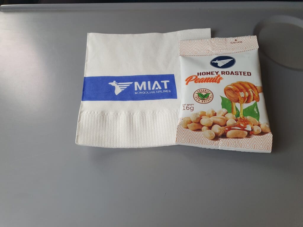 Whilst our departure and initial climb had lacked so much as a single noticeable bump, it was not until the aircraft ascended through 25,000 feet that the seatbelt signs were switched off. At this time the cabin lights were also turned back on and a couple of crewmembers passed through the cabin handing out immigration forms. Several minutes later, the aircraft levelled off at its initially cruising altitude at which point the Captain performed their brief welcome announcement in Mongolian and English. After leaving Korea’s southeast, unfortunately, a combination of haze and low clouds prevented any perfectly clear views of the mountainous landscapes below. However, as the aircraft neared Seoul, Osan Air Base could be seen before the aircraft turned towards the coastline and climbed once again to 36000 feet. Thirty minutes after leaving Busan, the crew passed through the cabin distributing packets of honey roasted peanuts which came in MIAT Mongolian Airlines branded packaging alongside serviettes featuring the airline’s logo. It is worth mentioning that whilst this pre-dinner was very much appreciated, no drinks were handed out, which, in my opinion, would have been rather welcome given the hot temperature of the cabin.
