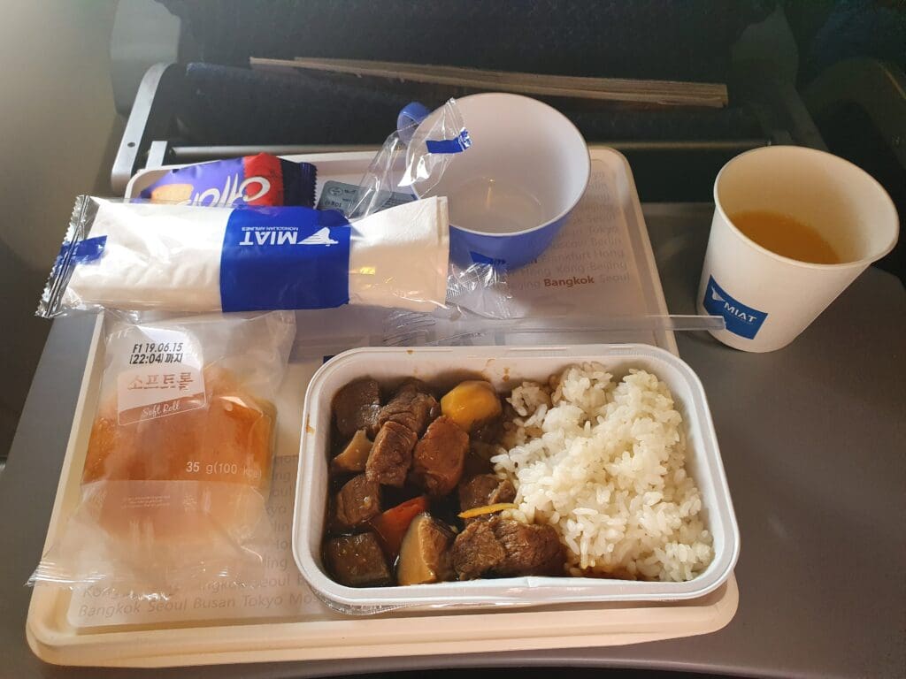 Opting for the beef dish, this was handed to me on a tray which, aside from the main dish, contained a limited selection consisting of a packaged bread roll, a packet of savoury crackers and a small tub of butter. I ought to mention that, everything on the tray, including the plastic mug, cutlery packet and butter appeared to have been heated. Consequently, the butter had melted entirely, although the inadvertently heated bread roll was also a nice touch! Upon opening up the foil container, I found the main dish to consist of chunks of beef in a sweet soy sauce which sat atop a bed of rice. Glancing over at my neighbour’s chicken dish, this appeared to consist of chicken with kimchi and rice, and upon seeing this I wished that I had opted for the chicken instead. Whilst the meal felt a little lacking, the quality of the main dish was not all too bad, although the rice did seem to be moderately overcooked and thus crispy. Once the majority of passengers had finished eating, at 1915 Mongolian time, the seatbelt signs were turned back on once again just as the hot drinks round commenced. Despite this, the crew pressed on first presenting passengers with a tray containing two different sorts of tea bags as well as a sachet of coffee. After this, another crew member came to fill passengers’ cups with hot water.