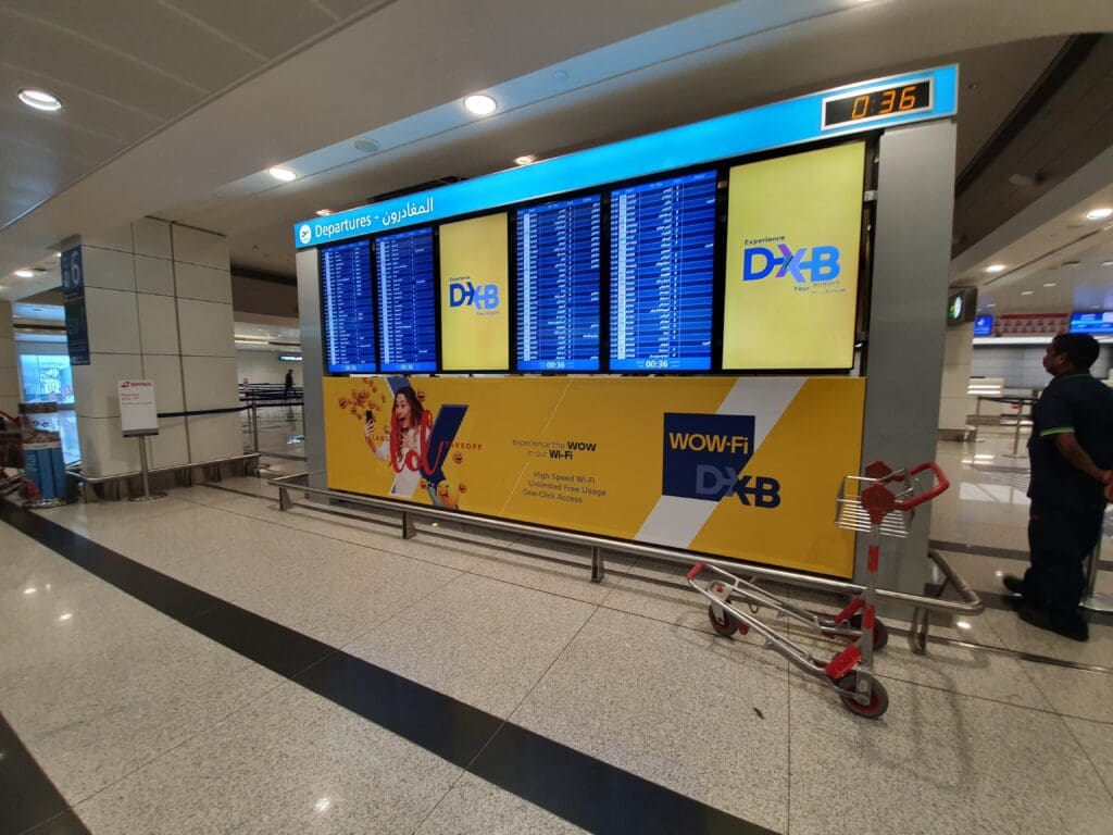 Whilst the landside area of Dubai International Airport’s Terminal 1 may be functional, it isn’t the most modern or stylish terminal in the world, being, I believe, the oldest terminal space across the entire airport. Furthermore, regardless of time, this seems to be eternally busy, with flights departing throughout the day and night. That morning, free seats were hard to come by and many passengers had taken to sitting on the floor. Meanwhile, whilst some parts of the terminal appeared to be spotlessly clean, others were in a somewhat poor state with a fair amount of rubbish strewn about. Other than the fancy-looking light fixtures in the main entry hall and the faux palm trees on the upper level of the terminal, this was not home to any particularly noteworthy architectural features, with low ceilings coupled with the many passengers giving the check-in hall a cramped feel. However, moving onto the positives, a good number of shops, cafés and restaurants could be seen dotted throughout the terminal. Meanwhile, fast complimentary wifi was provided throughout. Following a short wander around, I made my way to the upper level of the terminal which offered a good view of a small portion of Terminal 3 albeit through slightly mucky windows. Dimly lit and comparatively quiet compared to the rest of the terminal, I would recommend this part of the terminal to those who end up having to wait to check-in.