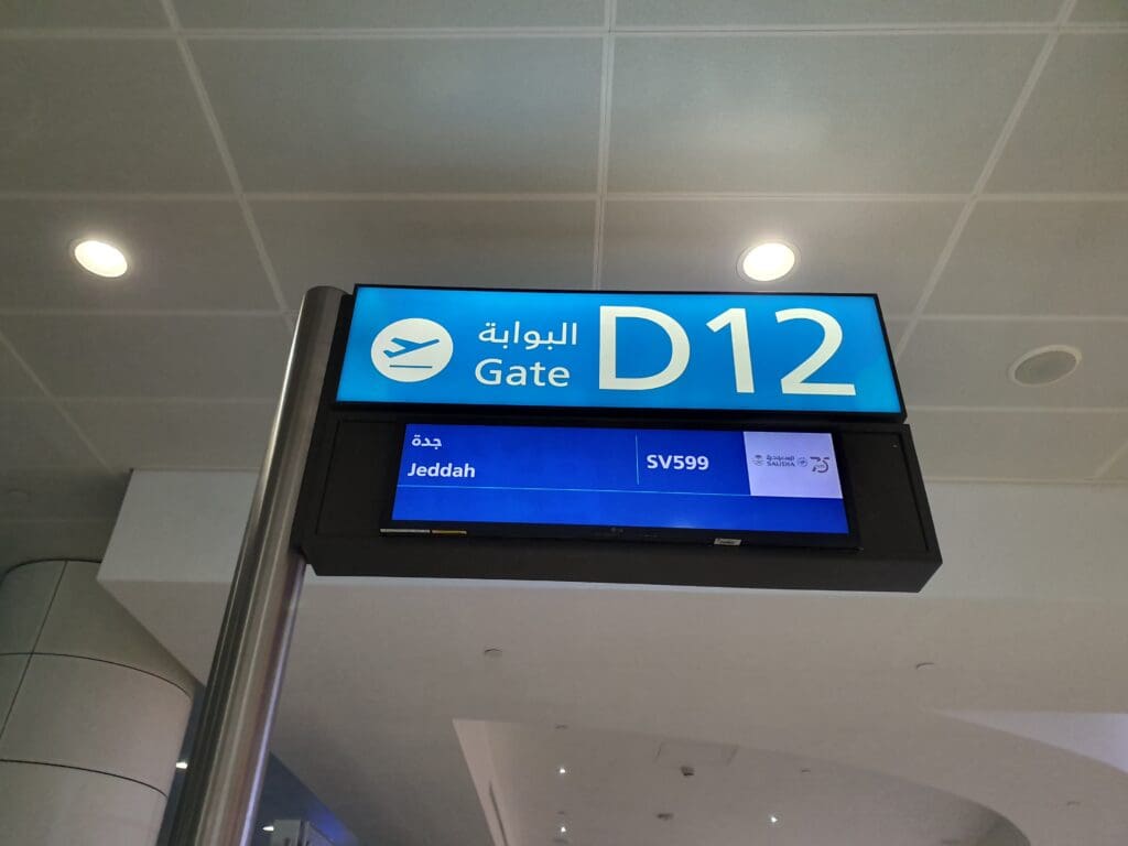 After watching the aircraft pull into the gate, seeing as I still had plenty of time to go before my flight’s scheduled boarding time at 0340, I decided to have another wander around the terminal to stretch my legs before the flight. At 0325 I returned to the gate which at that time was still relatively empty despite there only being 15 minutes to go until the scheduled commencement of boarding. Shortly after taking a seat, I received an email from Saudia informing me that boarding was now open for the flight to Jeddah. However, from my position pacing the gate’s counter, I could see that this was not the case. Nevertheless, I realised that this is a good way of ensuring that those who are always glued to their phone arrive at the gate punctually thus minimising the risk of a delay. As the clock struck 0340 an automated announcement rang out through the gate area in Arabic and English inviting all those passengers travelling in Business, Sky Priority holders and those needing assistance to board the aircraft, or to do so at their leisure. After no more than five passengers headed over to board, a couple of minutes later another announcement rang out, this time being a final call for the flight asking for all remaining passengers to board. Seeing this as my cue to get moving, I headed over to the podium where I had my boarding pass scanned and passport checked by a stony-faced Dnata worker before being allowed to head down onto the glass jetway.