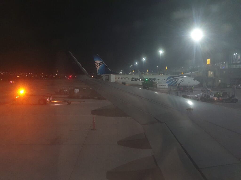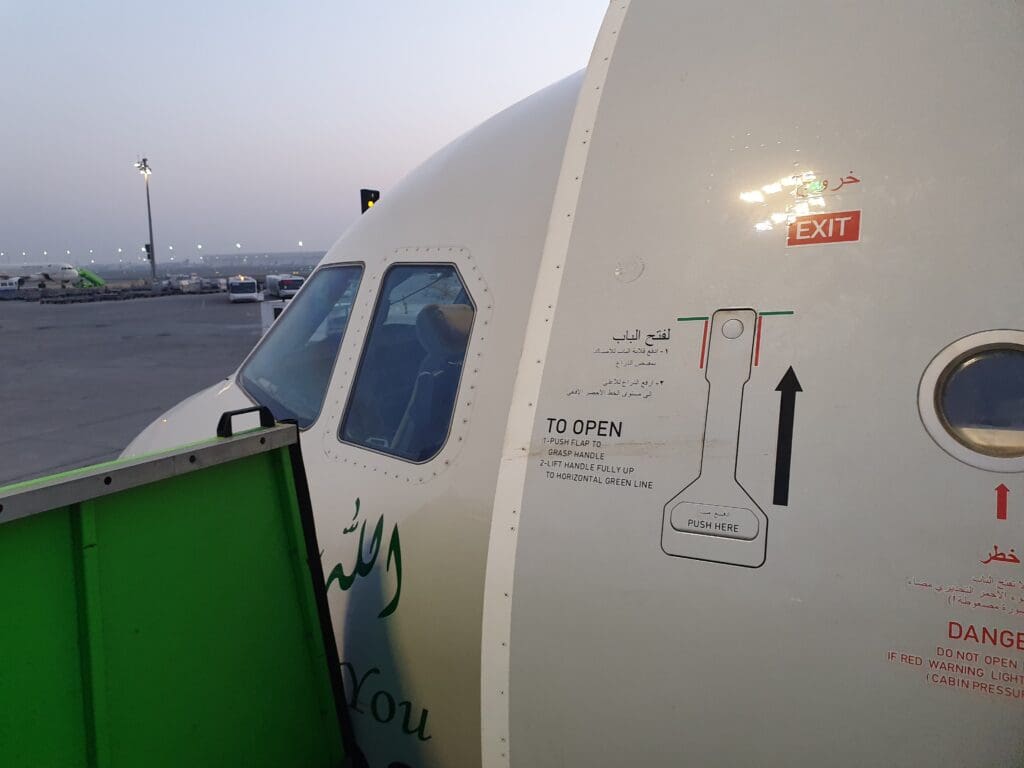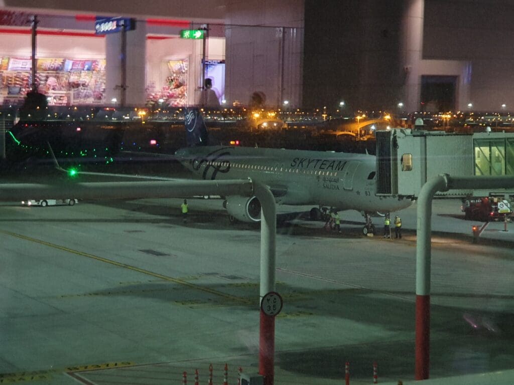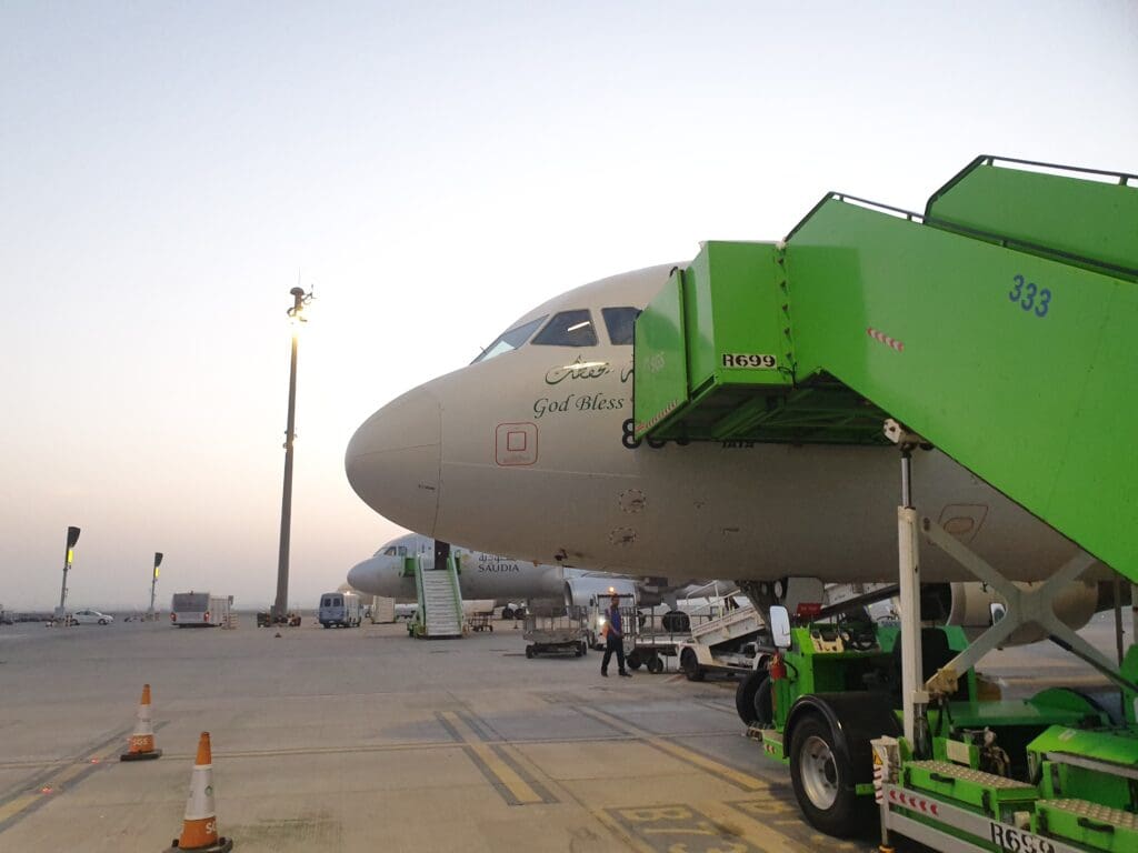 A total of ten minutes after landing in Jeddah, our A320 slowly pulled up to a remote stand alongside Saudia’s other Skyteam liveried A320 (the aircraft originally scheduled to operate the flight), HZ-ASF. Once the aircraft came to a gentle halt, there was no major commotion and perhaps all tired and weary, nobody seemed to be in a rush to exit the aircraft. However, thanks to the fact that a bus, airstairs and a range of other vehicles were already waiting at the stand to meet the aircraft upon arrival, disembarkation commenced promptly after the aircraft came to a halt.