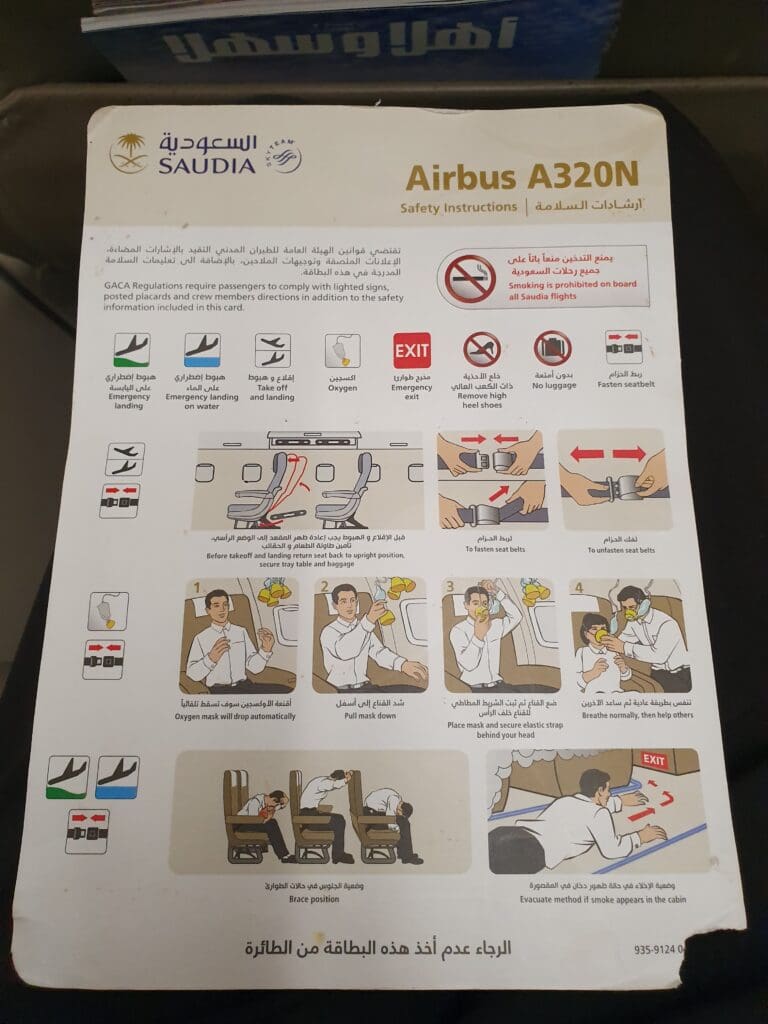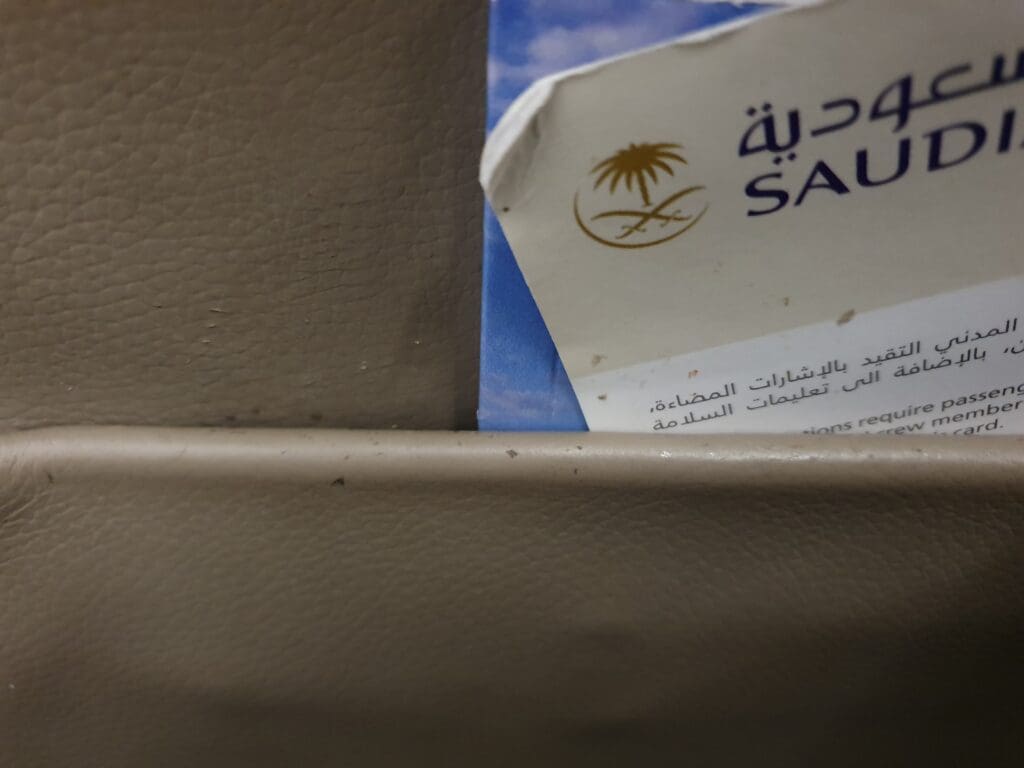 As one ought to expect, the aircraft appeared to be spotlessly clean and I failed to spot so much as a single crumb around my seat area. However, despite the young age of the aircraft, I was surprised and disappointed to notice an array of marks, scratches, worn-in dirt and stains around my seat indicating the cabin to be in severe need of a deep clean and some light maintenance. Turning to the seatback pocket, this contained a copy of the airline’s Skysales catalogue, the March 2020 copy of the Ahlan Wasahlan inflight magazine and the safety card. Interestingly, from the latter, I noticed that Saudia had given this specific configuration of A320 the name ‘Airbus A320N’, despite firmly being an Airbus A320 of the regular CEO variety.