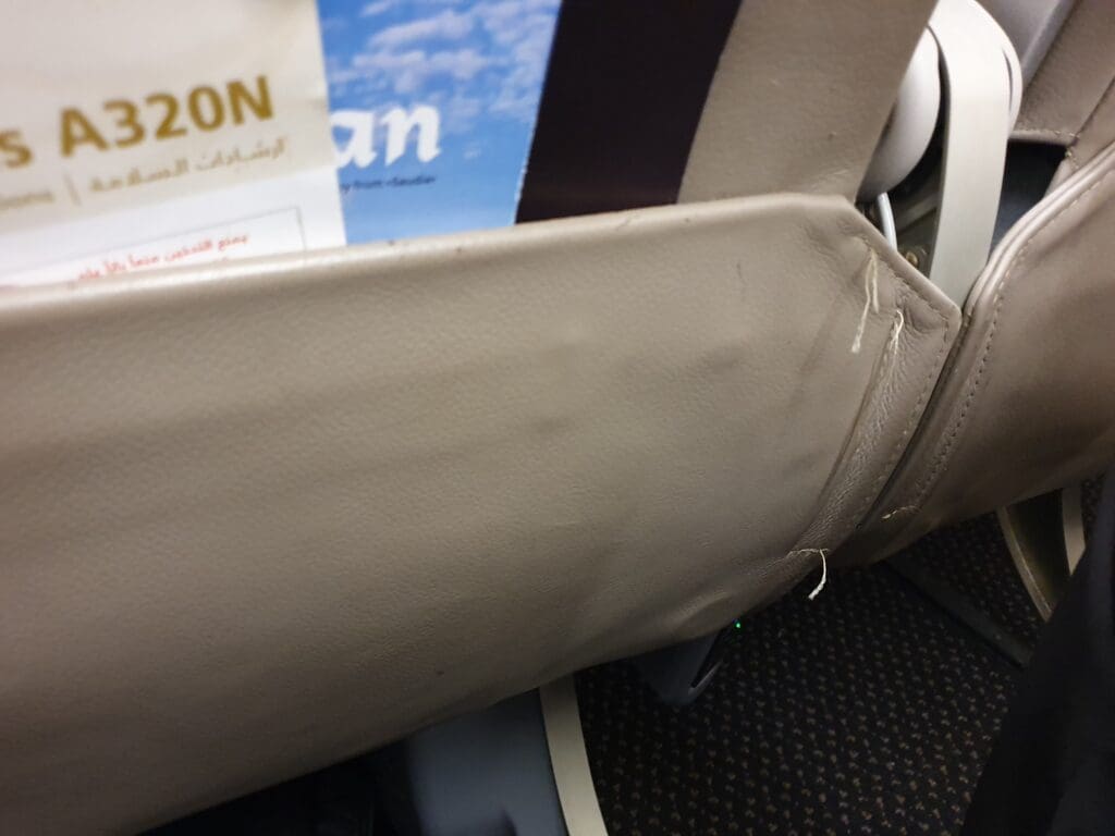 As I headed down the jetway and towards the aircraft, due to the position of the jet, views of my ride over to Saudi Arabia were minimal however I did get a decent view of the EgyptAir Boeing 737-800 at the neighbouring gate. This Boeing was the aircraft I would have departed on that morning had I not opted to fly with Saudia. Without any waiting, I stepped onto the faux wooden floor of the forward galley where I was immediately taken aback by the incredibly warm greeting from the Purser. Dressed in a uniform that a non-expert may claim to be pilot’s attire, the Purser gave me a reassuring pat on the back just before I headed into the aircraft’s Business cabin. There, 12 well-padded recliners, each fitted with the luxury of an inflight entertainment screen could be seen in a 2-2 arrangement. Admittedly, had I been a regular on the route and accustomed to the lie-flat Business product of Saudia’s widebodies and updated medium-haul Airbus A320, then I may have been a little disappointed with these. However, these are most definitely an upgrade for anyone who usually flies in business on intra-European flights.