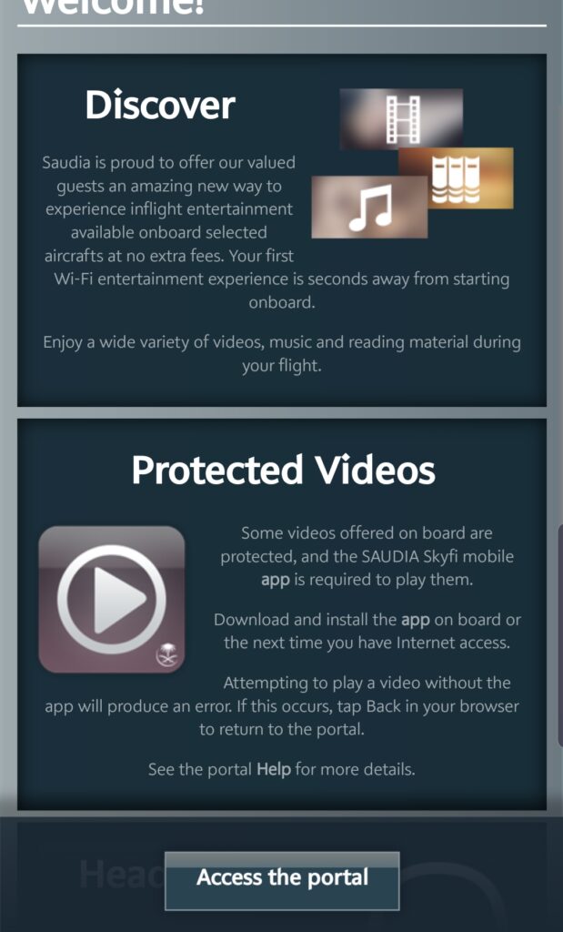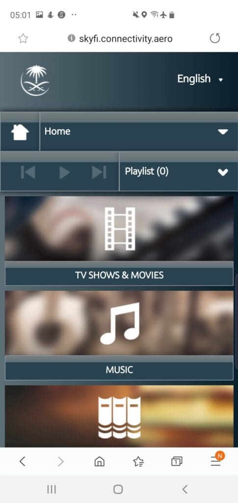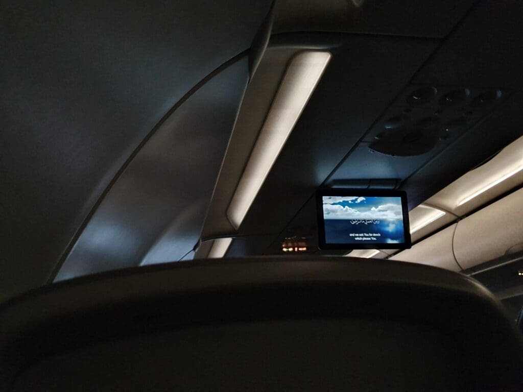 Once this drinks service had been made, no further rounds of service were made however I imagine that the crew would have been happy to deal with any requests for drinks during the flight. As soon as the crew finished their drinks round, the lights were dimmed and understandably many passengers drifted off to sleep. With little to see outside the aircraft, before taking a short nap I decided to explore the various entertainment options available. Whilst many of Saudia’s Airbus A320s are fitted with inflight entertainment screens in both Business and Guest Class, on those that lack these, a streaming service, officially referred to as the ‘Wireless Entertainment System’ is offered. Fortunately, I was able to connect to the aircraft’s wifi network and launch the entertainment system without any issues. Initially, I found this to be fairly well laid out, however, I could not ignore the presence of a message regarding ‘Protected Videos’ which required the airline’s entertainment app to play. However, not only was this app poorly advertised, my attempts to download this from the Google Play store several days before my flight had produced an error message. Moving on to the available content, lacking the expansive entertainment options that Saudia frequently promotes, this was highly limited to two programmes by the internet television channel Iqraa and a programme entitled ‘The Two Holy Mosques’. The fact that this aircraft usually only flies domestic flights may perhaps explain this limited selection of content. However importantly, the moving map did work without any issue!