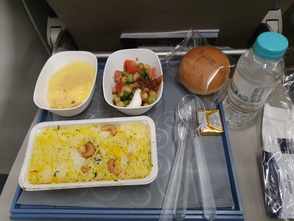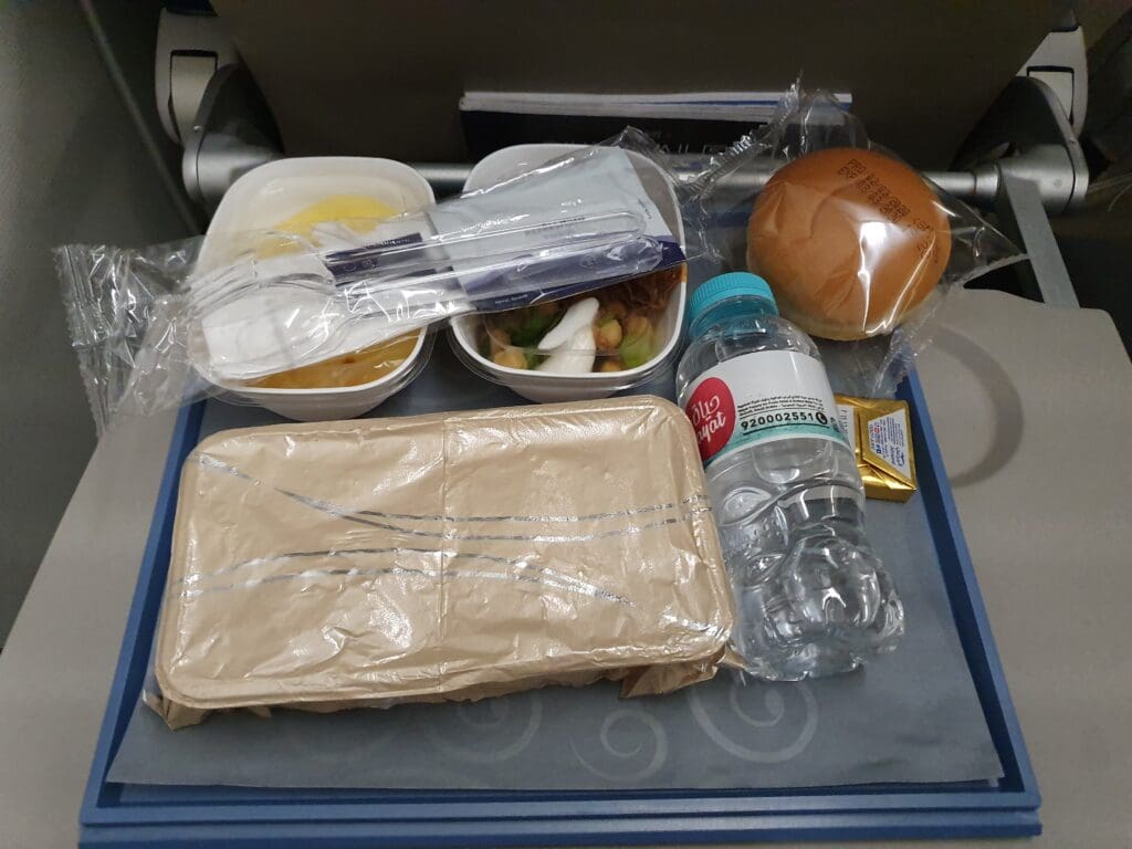 Perhaps realising that most passengers just wanted to sleep, the meal service commenced only a very short time after the seatbelt signs were extinguished. This involved two trolleys – one rolled to the front of the cabin and the other commencing its journey rearwards from Row 41 ensuring that I was one of the first passengers onboard to be served that morning. This occurred less than twenty minutes after departure as we neared our cruising altitude of 36,000 feet above the Emirate of Abu Dhabi. Whilst no paper menus were present on this flight, I was asked whether I wished for a chicken biryani or a cheese and pesto pasta dish in a polite and friendly manner. Whilst neither were typical breakfast options, often finding mid-flight breakfasts underwhelming I could not complain about this. Opting for the biryani, I was promptly handed a tray featuring a foil-covered container, a 200ml bottle of water, two side dishes (one containing a chickpea salad and the other a custard-based dessert), a packaged bread roll and a packet containing plastic cutlery. Interestingly, no drinks were offered at this stage however once all meals had been handed out, a drinks round was made. Despite being a little on the small side, the cashew-topped chicken biryani was delicious as was the chickpea salad and nondescript custard dessert. All in all, this meal was substantial enough and I ended up with little to complain about regarding this especially considering the length of the flight. Just before entering Saudi airspace near the southwestern corner of the United Arab Emirates, the crew returned to my row offering drinks. By this time, I had embarrassingly polished off the meal entirely and so the crew happily removed my tray. Opting for a coffee, this was handed to me in a logoless paper cup along with a stirrer and a serviette.
