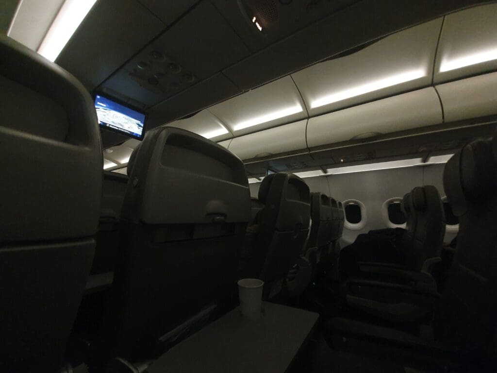 Following my short exploration of the entertainment options, still with little to see outside as we cruised high above the dark desert and feeling incredibly tired I decided to stretch out for a nap. Despite successfully drifting off within a minute or so, being a light sleeper I was awoken just as the aircraft hit its first patch of light turbulence around forty minutes later. By this time, the Airbus was just about to cross into Makkah Province, Saudi Arabia’s most populous region with a little over 8.5 million residents. As we cruised westwards towards the Red Sea coastline, for the first time after leaving the United Arab Emirates I noticed the orange glow of several towns 36,000 feet below the aircraft. Meanwhile, inside the cabin, the majority of passengers appeared to remain fast asleep. Seeing as there was not too long to go until the aircraft arrived in Jeddah, at this point I decided to pay a visit to one of the two lavatories at the rear of the aircraft. As you would expect, this was typically A320 in style, being neither spacious nor incredibly cramped. However, I was immediately disappointed by the fact that this appeared to be in a battered and dirty condition. The latter came as a slight surprise given the length of the flight and the fact that most passengers appeared to have spent much of this asleep.