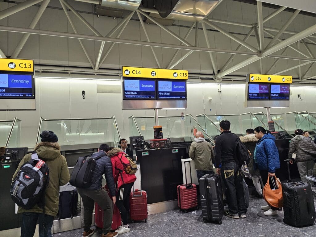 That day, with three Airbus A380 departures and one Boeing 787-9 Dreamliner operated service to Abu Dhabi, in total up to 1725 Etihad Airways passengers (plus any infants on laps) may have departed from Heathrow. Thus, London Heathrow is one of Etihad Airways’ busiest stations and I was not surprised to be greeted by the sight of plenty of the airline’s signage and branding across a near-endless row of desks. Like many airlines at Heathrow, Etihad Airways outsources their front-of-house handling services at Heathrow to the Emirates Group’s handling company, Dnata, whilst a fair number of Etihad Airways staff were also on hand. Upon nearing the entrance to check-in, I was soon pointed towards the queue for those who were yet to commence check-in formalities.