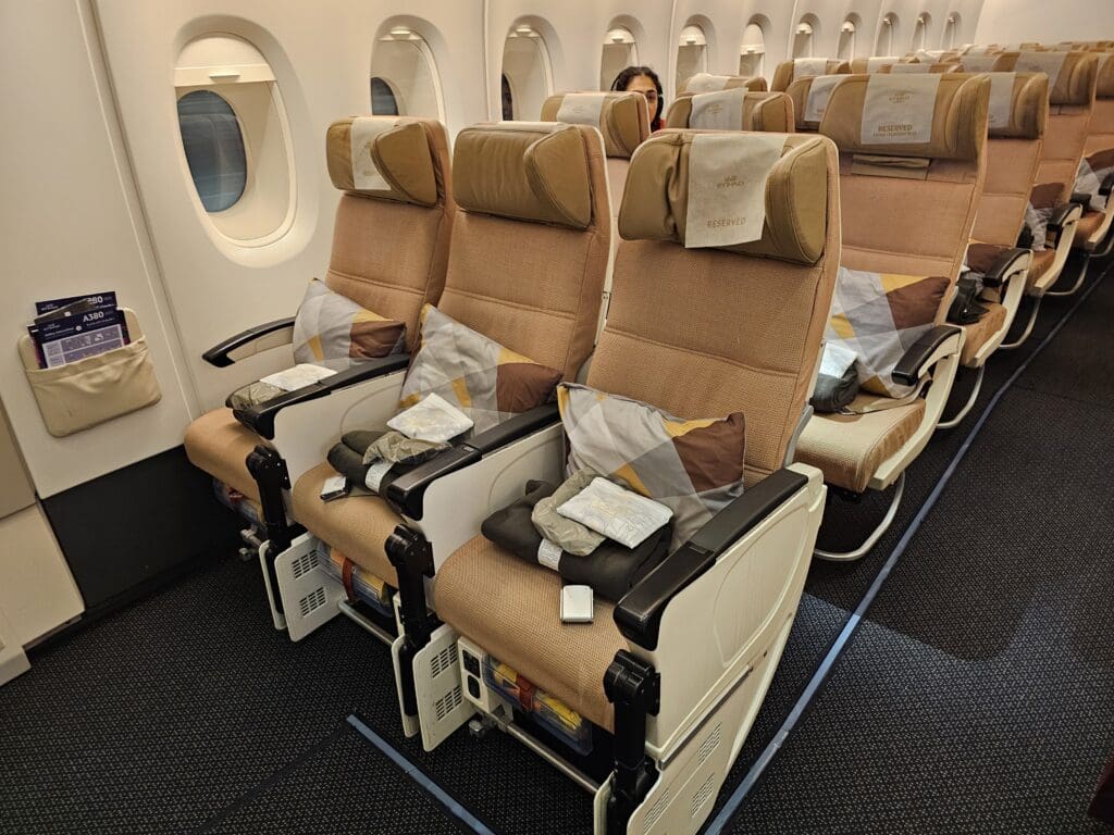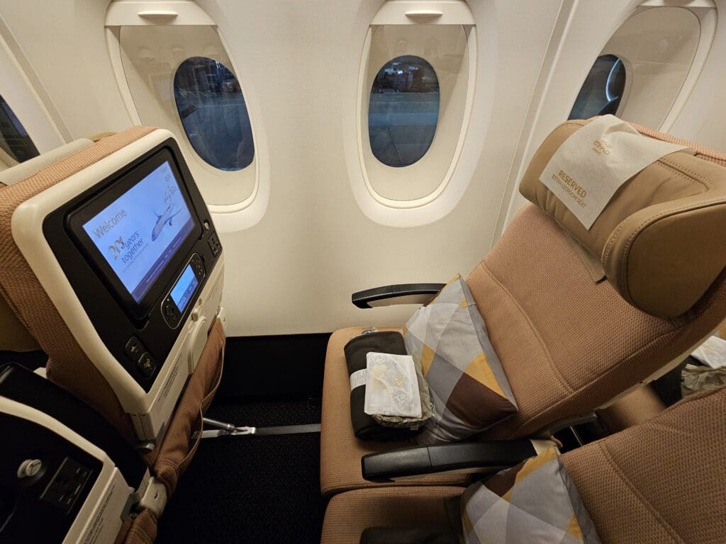 Once all had been booked, I was able to use Etihad Airways’ website to add a range of additional extras – these included booking a seat on the airline’s complimentary shuttle buses to Al Ain and Dubai, adding additional luggage, pre-selecting special meals, adding priority check-in services and selecting a seat for the ride. Focusing on the latter, seeing as I would be travelling on a Choice Plus fare, I was eligible to select an extra legroom seat and opted to make the journey in 45K, located at the front of the lower deck. In addition, I should also mention that I ended up having to contact the airline regarding their shuttle bus before my trip, whilst I initially ended up going around in circles with their AI chatbot, eventually, I connected to an agent and found them to be helpful and able to solve my issue within a few minutes.