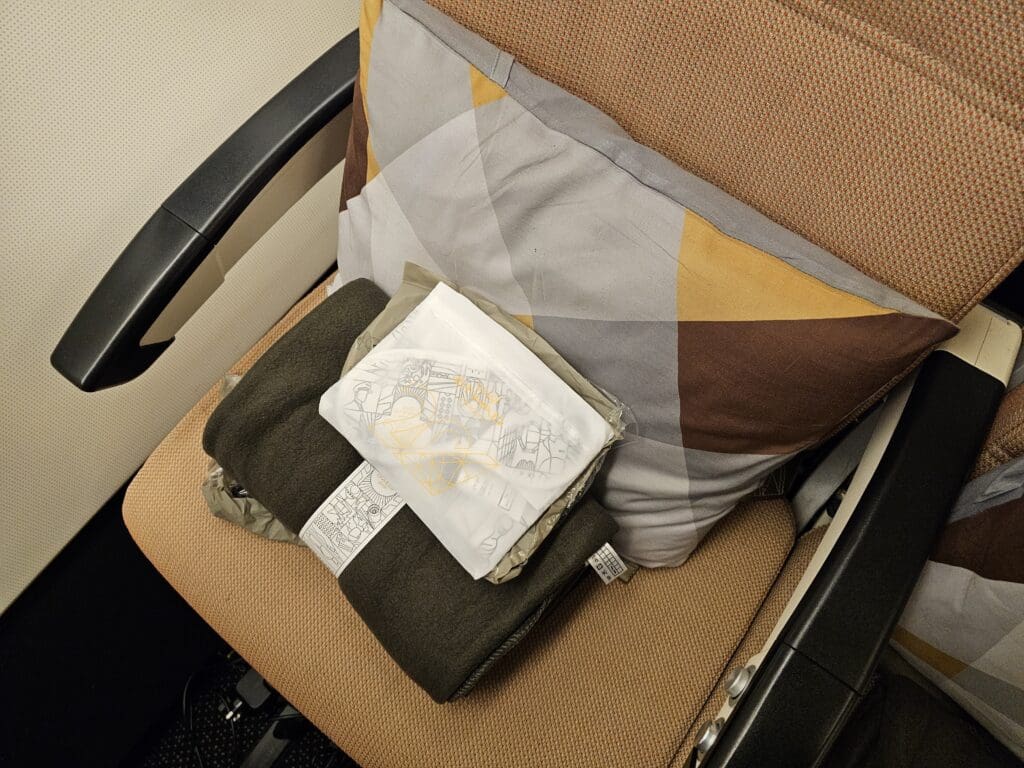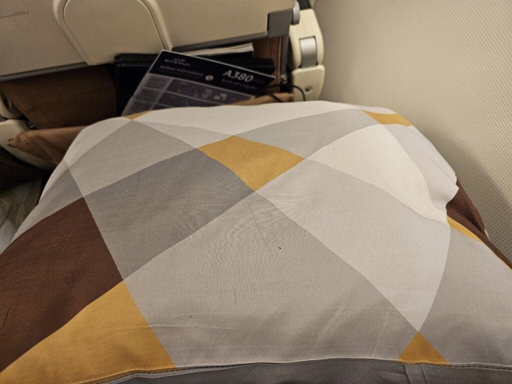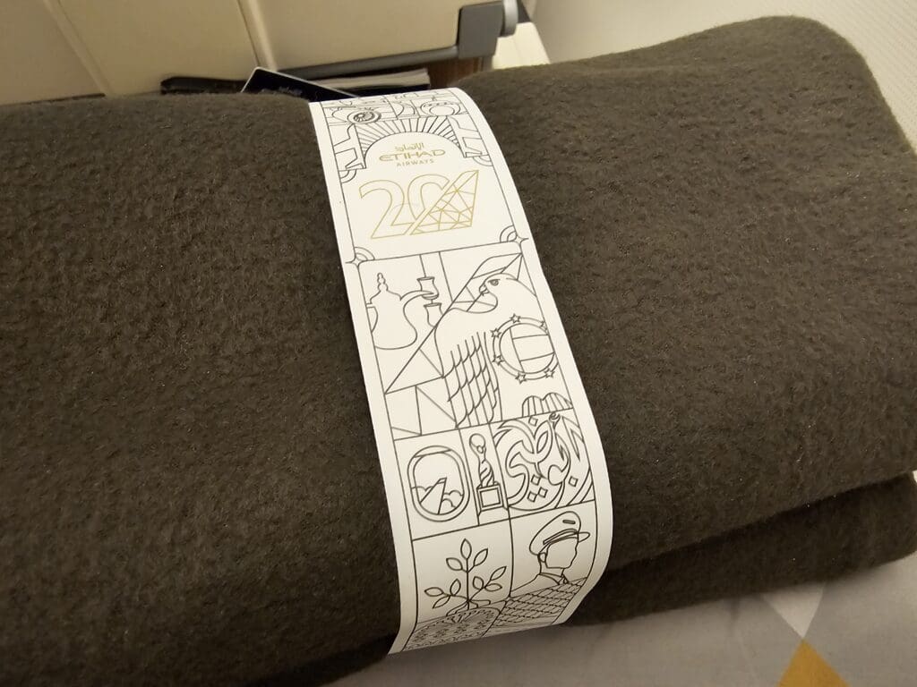 Meanwhile, the rears of these feature a bi-hold tray table and a seatback pocket that featured the latest copy of Etihad Airways’ monthly Atlas magazine, a safety card and a sickbag. Meanwhile, entertainment was provided in the form of an 11.1-inch wide (28.19cm) inflight entertainment screen powered by Panasonic’s eX3 system. Below this, a digital controller could be found, whilst both a USB port and a universal power outlet were located on each seatback. Upon boarding, a decent quality blanket and pillow had been placed on each seat along with what seemed to be an above average quality headset (for economy) and an amenity kit which contained a sanitising wipe, toothpaste-brush set, an eye mask and ear plugs. With the latter being something that many airlines have long eliminated, this was a very nice touch.