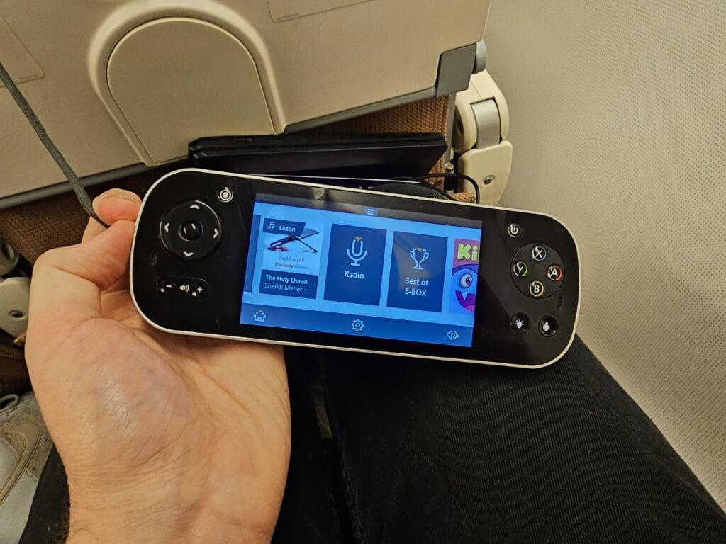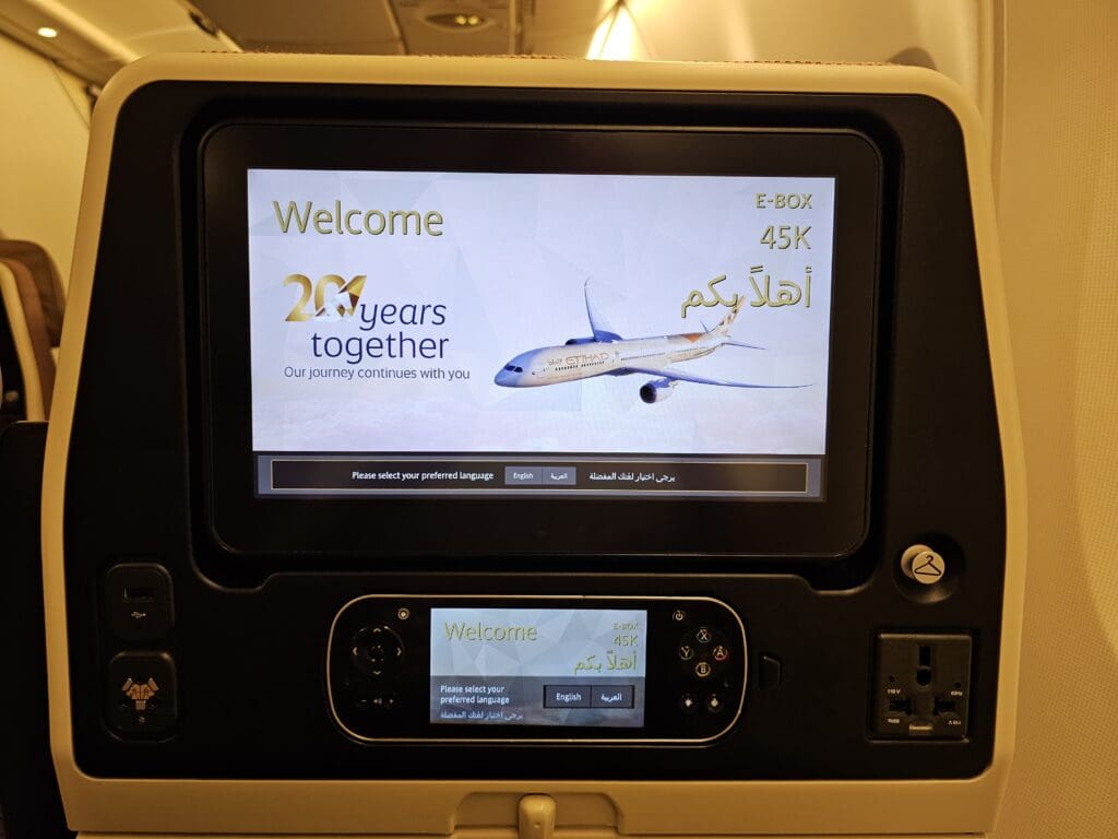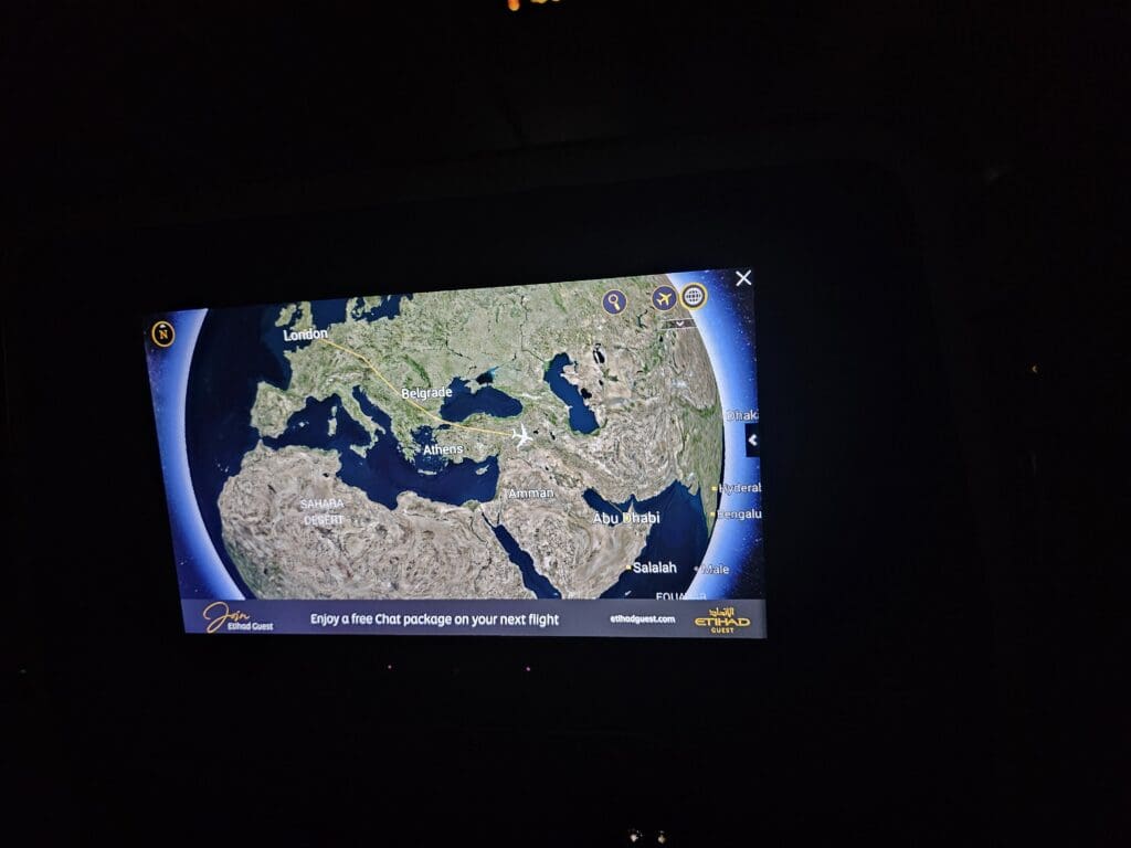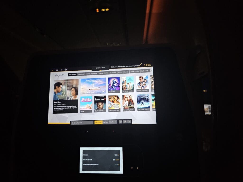 With little to see outside and unable to get back to sleep, I decided that it was an opportune moment to explore Etihad Airways’ E-Box entertainment system. Despite being an airline with an expansive route network and global reach, this system is offered in just two languages, Arabic and English. However, other than this, I was left with very little to complain about, and I found the system to be laid out in a modern yet not too overly complicated manner, with the screen being responsive to touch and quick to transition between pages. Additionally, as is slowly becoming more common, the inflight entertainment system allows passengers to share video content with other seats, enabling two passengers to watch the same content at the same time on two different screens.