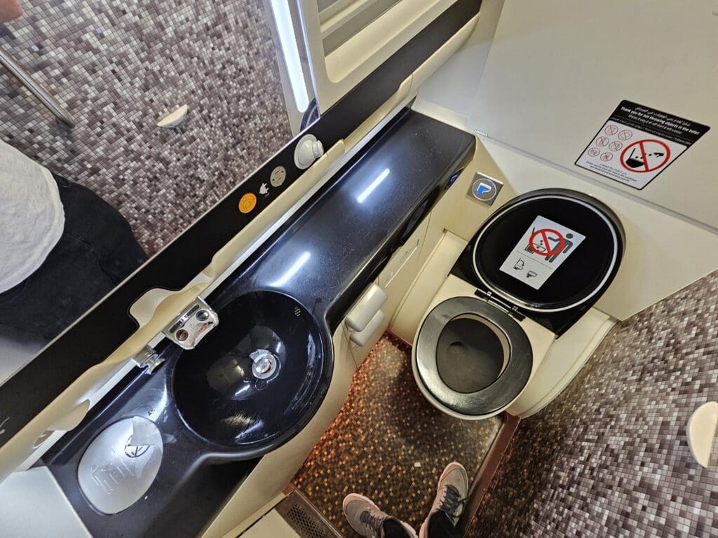 With few passengers in front of me, I arrived at my seat in a matter of seconds. Seeing as I was yet to be joined by any neighbours, once I had stowed my back in the Airbus’ large overhead lockers, I decided to make a pre-departure lavatory trip to one of the ten lavatories available to those in Economy. Onboard, there are 41.7 Economy passengers to a lavatory, a fairly standard ratio for a widebody jet. Visiting one of the two lavatories on either side of the main deck’s forward galley, upon opening this up, I found the lavatory to be spacious, and somewhat unique in its design thanks to a fair amount of black plastic panelling, appearing to have been significantly customised by Etihad Airways. Importantly, this was clean, tidy and stocked with the basics, thereby leaving me with no complaints.