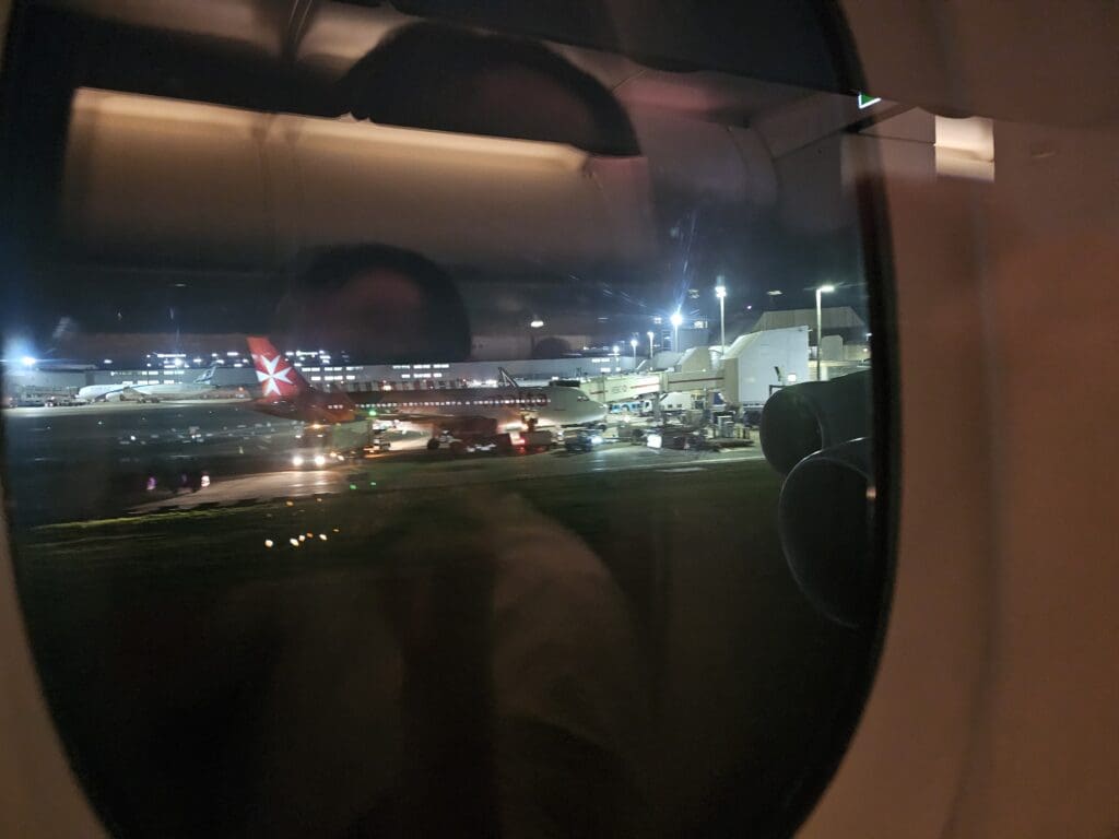 By the time these videos had come to an end, we reached our scheduled departure time although there was still no sign of any movement. Having a look outside via the three external cameras accessible via the inflight entertainment system, these revealed that the jetbridges had all been removed and the tug was connected ready to push the Airbus back from its parking position. Ten minutes after our scheduled departure time, the Captain announced that owing to the high volume of departing traffic, our departure had been delayed and we could expect to be pushed back within ten minutes. True to this, at 2106 gently jolted backwards and was pushed back away from the gate. As we journeyed rearwards, the Airbus’ four massive Engine Alliance GP7270 engines quietly spooled into life, failing to create much by way of noise or vibration as they hummed in preparation for our journey over to the Middle East.