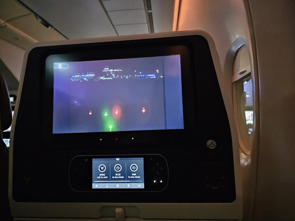 With twelve minutes to go until our scheduled departure time, boarding was announced as complete at which point the Canadian-accented Captain performed their welcome announcement. This informed passengers of the 6H05 flight time and the weather in Abu Dhabi before promising to update us with updated information before our arrival in the United Arab Emirates. This was then repeated by a longer announcement from an Arabic-speaking crew member, who also performed their own welcome announcement before the Romanian Cabin Manager undertook their long welcome announcement in English. Once this long slew of announcements had come to an end, the inflight entertainment screens were locked and Etihad Airways’ safety video was broadcast. Released in 2021 in partnership with the Louvre Abu Dhabi, this consists of various crew members going through the safety instructions in the gallery’s unique surroundings and was broadcast in English and Arabic, accompanied by subtitles in both languages. Lasting about eight minutes, this ended with an advertisement for the government’s foreign aid agency, the Abu Dhabi Fund for Development.