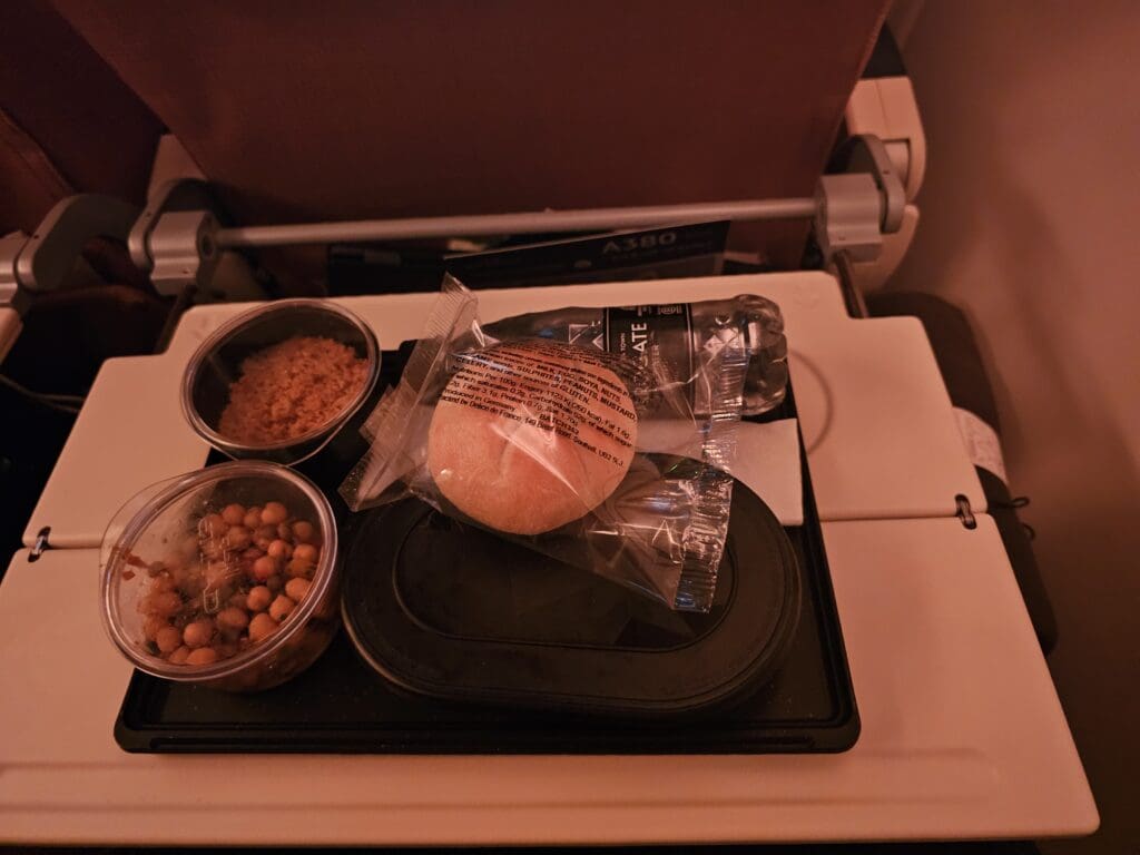 Not long after passing the city of Kirkuk and as we neared Baghdad, the mood lighting was turned on to its orange glow setting no more than two hours after the cabin lights had been turned off. At this time, the scent of warming food once again wafted through the cabin and as we neared Basra in Iraq’s far south, the crew took to the aisles and began the quick distribution of the second meal service of the flight. With this being a relatively short overnight flight, many may suggest that this second meal service was not needed. Furthermore, given the fact that the flight was scheduled to arrive in Abu Dhabi at 0755, it would have been far more appropriate and appealing for this second service to consist of a light breakfast. Or perhaps for a full breakfast to be served as the main meal, with a pizza slice or similar served after departure considering that many will have eaten before boarding.