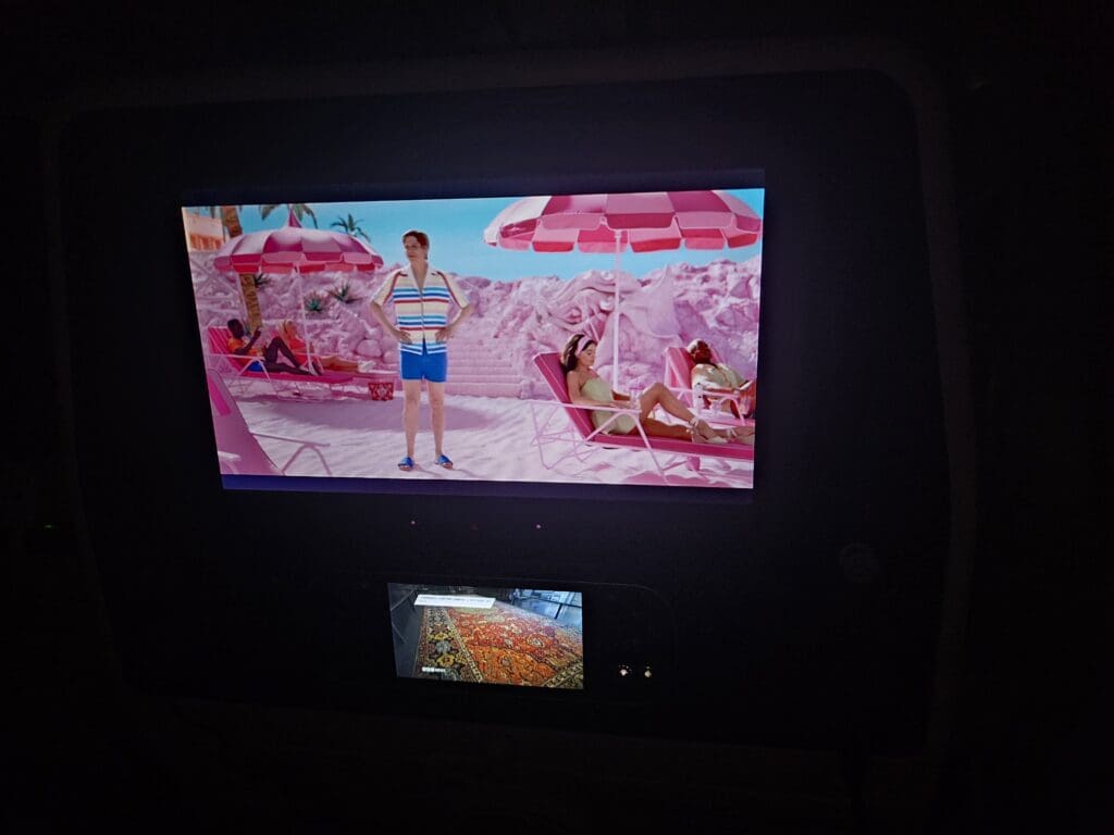 Turning to the remote control, this was essentially a miniature version of the inflight entertainment screen and rather ingeniously enabled passengers to watch two things at once. For example, if needing to keep up to date with the world, you could watch a film on your main screen whilst broadcasting a live news channel beneath this – albeit without sound. Whilst having no real intention of watching anything, I decided to start playing one of the newest films on the system, Barbie, released five months before my flight. This commenced with advertisements for Aldar Properties and the Gran Turismo film, although these could be skipped.