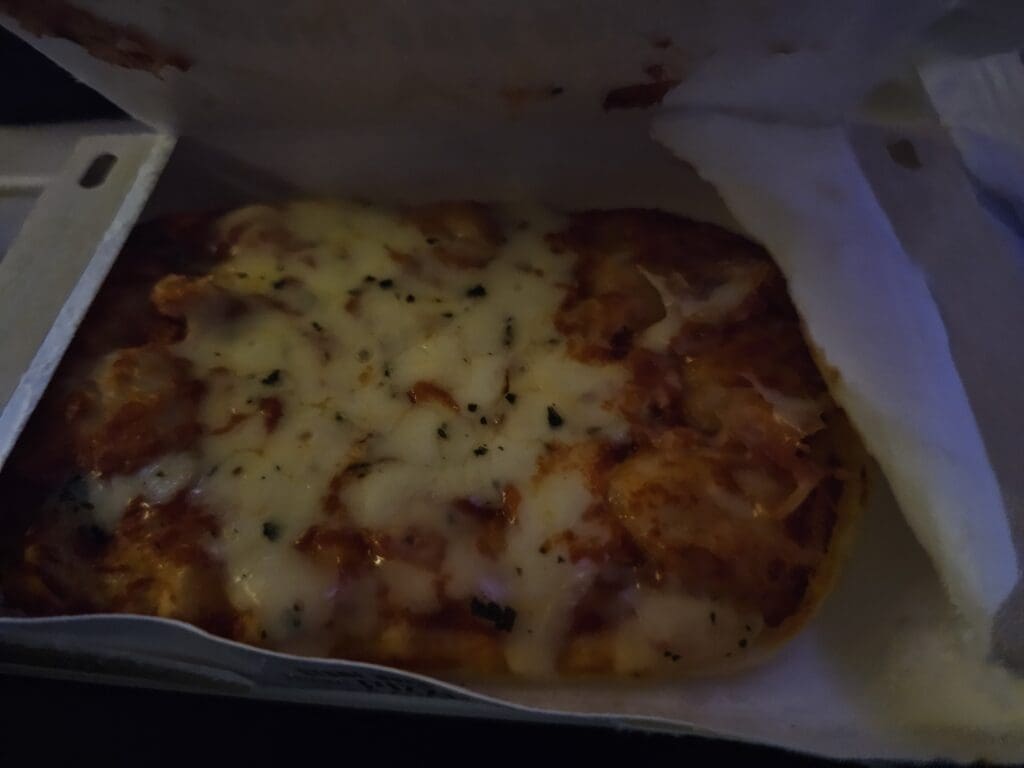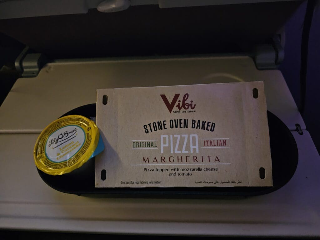 Soon, at around 0210 Greenwich Mean Time or 0610 UAE time, I was handed a reusable plastic basket which contained a cardboard box with a warm slab of Margherita pizza and a small container containing a Lily O’Brien’s lemon cheesecake. Unsurprisingly, many passengers were either still asleep or decided to pass on this second offering. Seeing as I had had dinner just over three hours earlier, I was still rather full yet seeking to get the full Etihad Airways experience, I decided to be greedy and partake in this meal service. Once again, I found the crew member handing these out to be rather cold and brash, although, to my delight, the crew member responsible for drinks was a lot friendlier. Opting for an Arabic coffee, they thoughtfully warned me that this was not a ‘real’ one and instead came from a sachet. Coincidentally I had received the exact same warning on my last Etihad Airways flight and so I knew exactly what I was getting myself into!