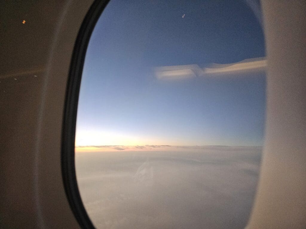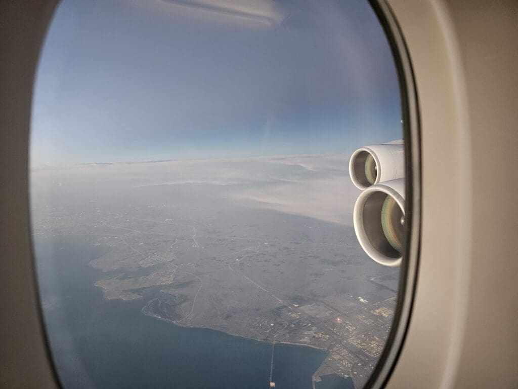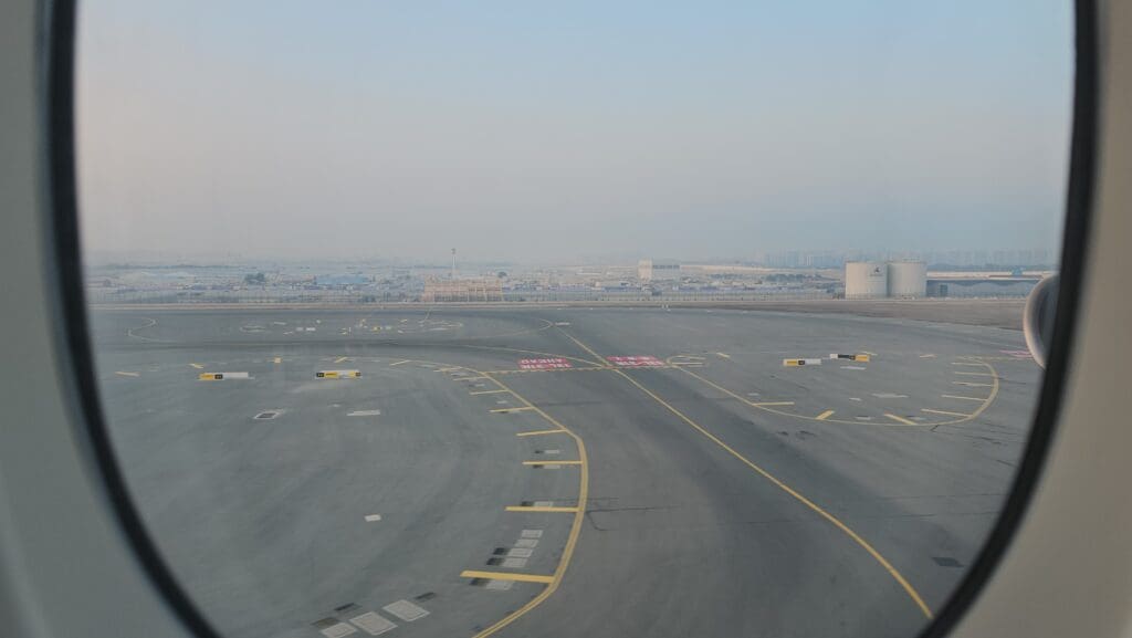 In terms of the quality, the pizza was most certainly nothing special and seemed to be unhealthily greasy, especially given the time of day! However, this was still appreciated and left me with few real complaints. By the time I had finished this, the aircraft had passed through the narrow channel that separates Kuwait from Iran, crossing the shores of Iraq’s very short stretch of coastline and was now cruising over the waters of the Persian Gulf. As we flew parallel to the shores of Saudi Arabia’s Eastern Province, the skies began to brighten ending the short night and heralding the commencement of a new day in the Middle East. At this time, I noticed that a list of connecting flights and their gate numbers was made available on the inflight entertainment system. Whilst this was of no use to me, I found this to be a nice and helpful touch for those heading onwards to destinations across the world – although one that is fairly common on hub-and-spoke airlines.