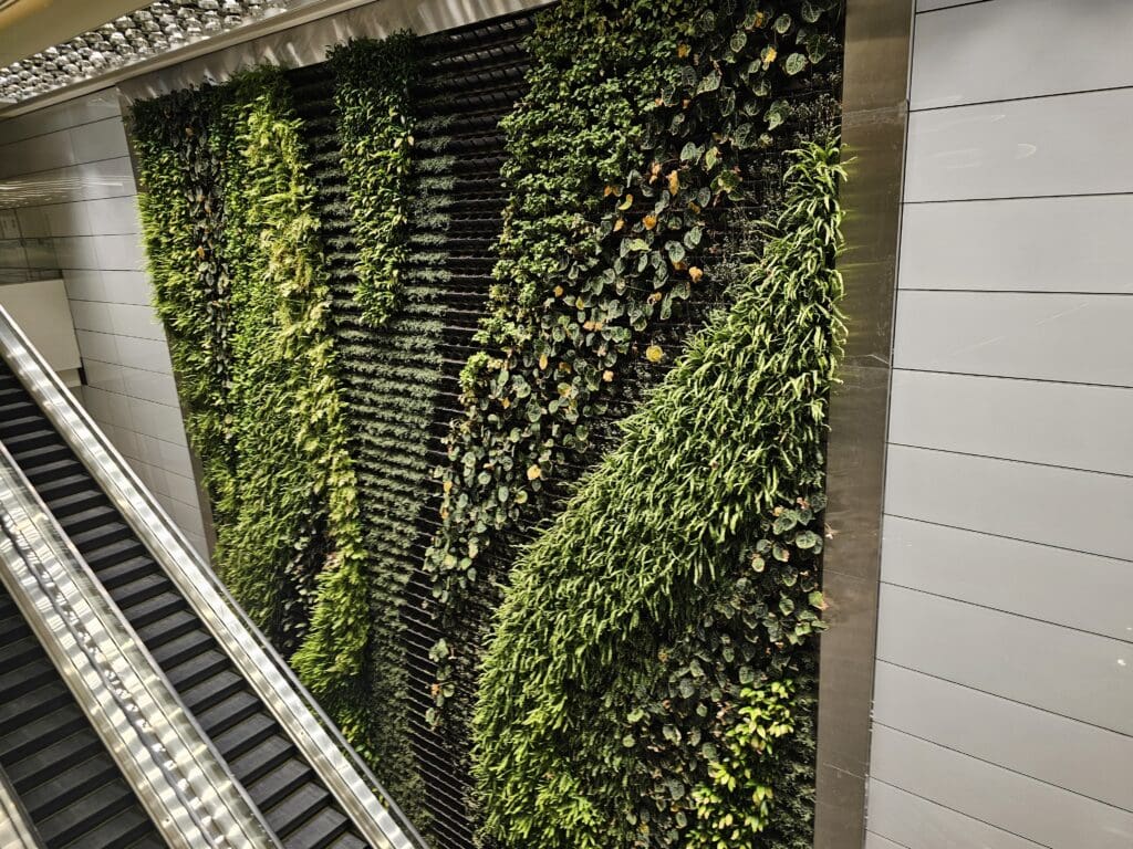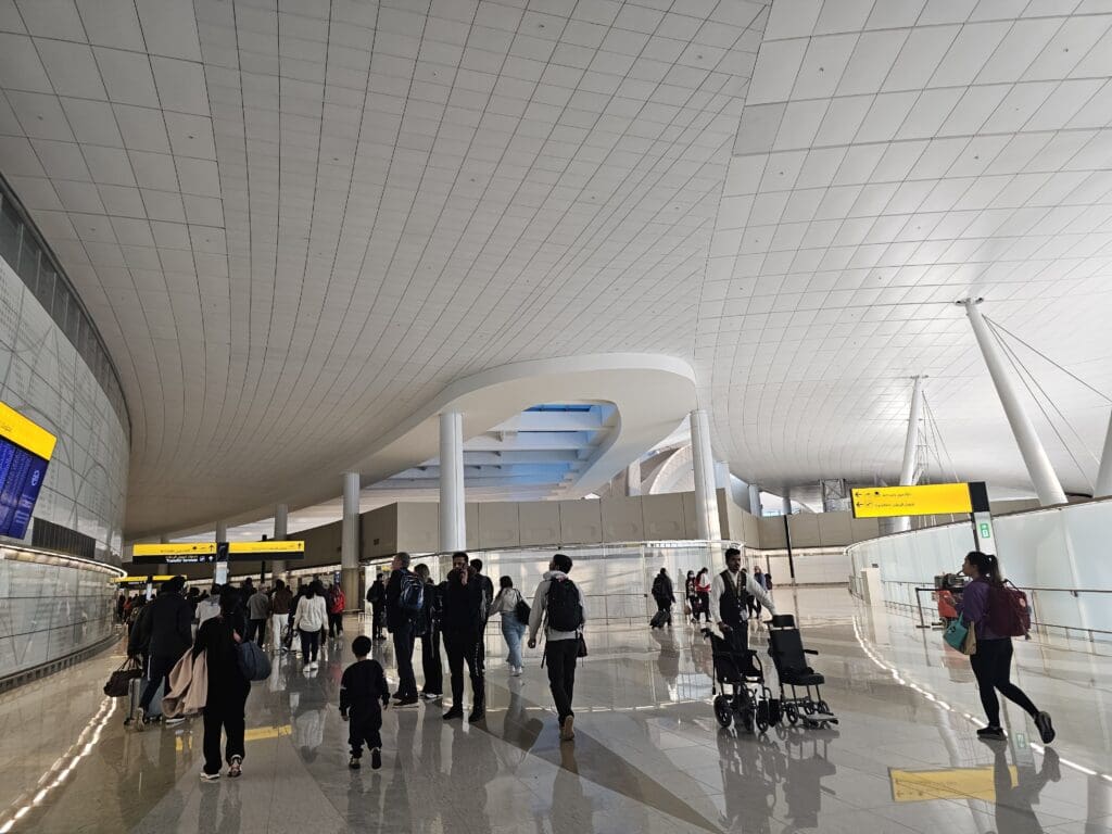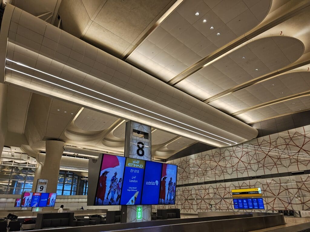 Once inside the shiny new terminal, those connecting to onward destinations were split off, leaving just a fairly small number of passengers from the London flight to proceed onwards to immigration. From there, I headed down a long escalator to the ground floor level of the terminal and passed a green wall of plants before arriving at the large immigration hall. According to the immigration rules, I could have used the e-gates seeing as I had entered the United Arab Emirates within the past year, and whilst a family member who had arrived the previous week did so, I was informed by one of the airport staff that I instead had to join the snaking queue leading up to one of the few open immigration counters. At that time of the morning, many of those waiting there consisted of passengers from Air France’s flight from Paris CDG and by chance, I spotted my father who had arrived on this flight, waiting around twenty passengers ahead of me!