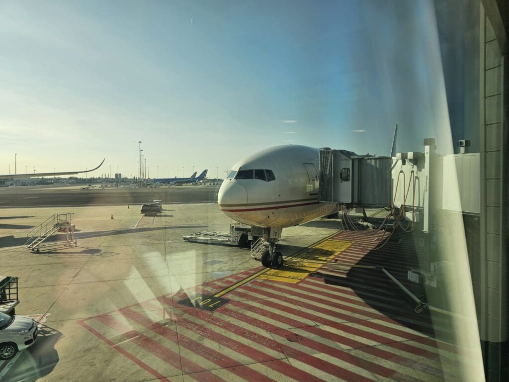 Once those bound for Doha had boarded the neighbouring Airbus A350, the gate area temporarily quietened down, although it wasn’t long before the Abu Dhabi-bound passengers began to filter through from the main terminal. According to my mobile boarding pass, boarding was set to commence an hour before departure however, I felt that this was a little exaggerated despite the Boeing 777’s large size. However, at 0920 I was proven wrong when two gate staff appeared and immediately announced the commencement of boarding. This began with an invitation to those needing assistance and passengers in Group 1 to make their way forward. With just a trickle of passengers making their way to the aircraft at this time, a minute or so later, those in Group 2, which includes passengers travelling in the rearmost Economy cabin, were invited forward. Falling into this category, at this time I made my way to the podium where I had my boarding pass scanned and passport checked before I was wished a nice flight by the friendly ground agent manning the podium. From there, I travelled down a short escalator and trundled down the single jetbridge that was connected to the aircraft that morning.