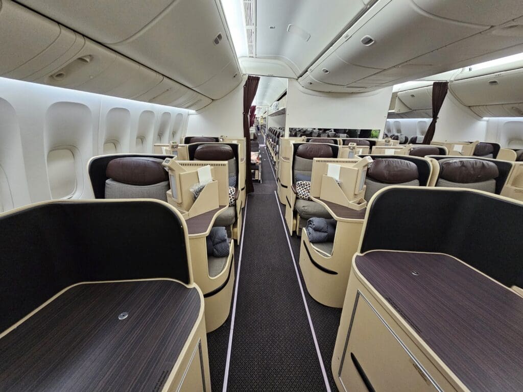 With just one passenger in front of me, no waiting was required as I neared the L2 door, and I soon stepped into the galley that separated the two Business cabins. Getting my experience with the crew off to a good start, immediately upon stepping into the aircraft, I was given a friendly welcome and after being directed down the second aisle, I journeyed into the cabin. First up on my trek to the rear of the aircraft was the smaller of the two Business cabins. This is home to three rows of lie-flat seats in a 1-2-1 configuration. Whilst I am certainly not a luxury travel connoisseur and would have happily accepted the invitation to travel in one of these seats that day, these seats appeared to be a little more dated and less private than those of several other carriers.