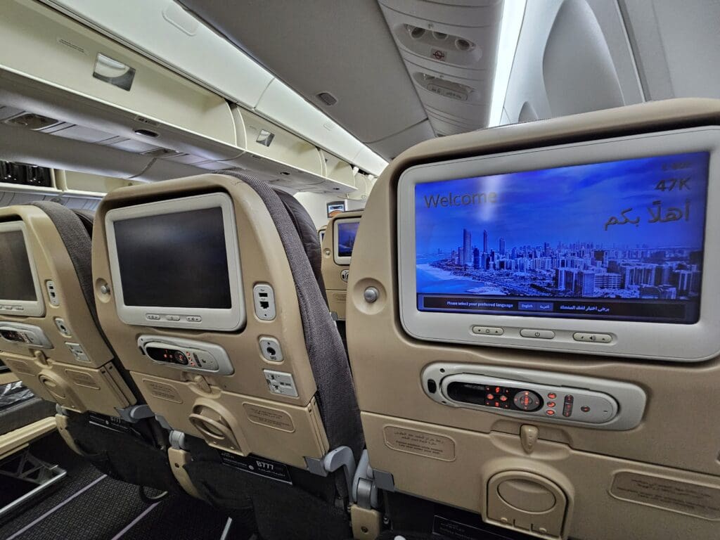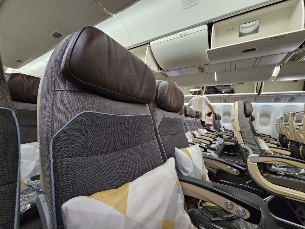 Continuing onwards down the aircraft, I entered the forwardmost of the Boeing’s three Economy cabins where I received another warm welcome. In Economy, Etihad Airways has opted to fit their Boeing 777s with the more squeezed 3-4-3 layout rather than the 3-3-3 configuration, and each Weber 5751 seat is covered in a dark two-tone fabric cover and complete with an adjustable headrest. Each of these also features a personal inflight entertainment screen and clunky controller, a plug socket, a USB-A port and a seatback pocket. That morning, a packet of headphones, blanket and pillow had been placed on each seat upon boarding, and it is worth noting that the latter was nicely designed and seemed to be of a higher quality than your typical cheap Economy class pillow.