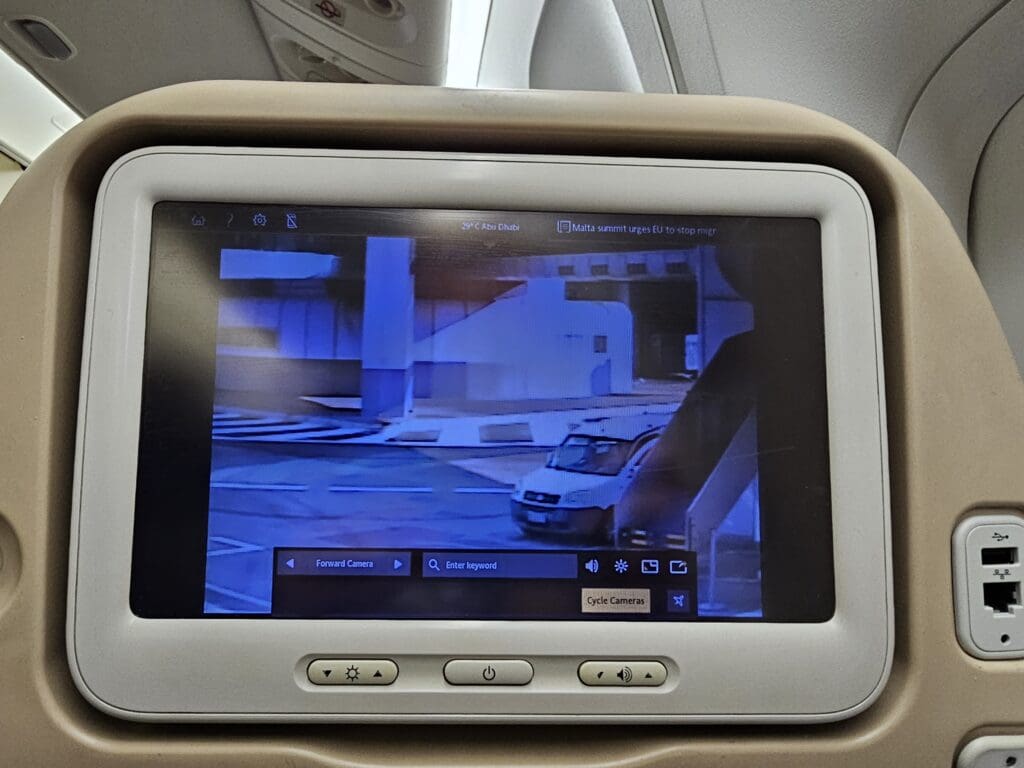 Once seated, it wasn’t long before the rearmost cabin began to fill up whilst outside a seemingly endless stream of ULD containers could be seen being loaded into the aircraft accompanied by plenty of jolts and thumps as these were moved into position below. Back inside, I was soon joined by seatmates, who, like many of my fellow passengers came in the form of Australian tourists commencing their long trek back Down Under and were presumably connecting onwards to Etihad’s evening flight to Melbourne. As the final passengers made their way into the aircraft, at 1000, the Captain’s voice filled the cabin as they performed their welcome announcement first in Arabic, and then again in English. This consisted of the usual welcomes and thanks, a mention of the short flight time of five hours and an update on the balmy weather in Abu Dhabi.