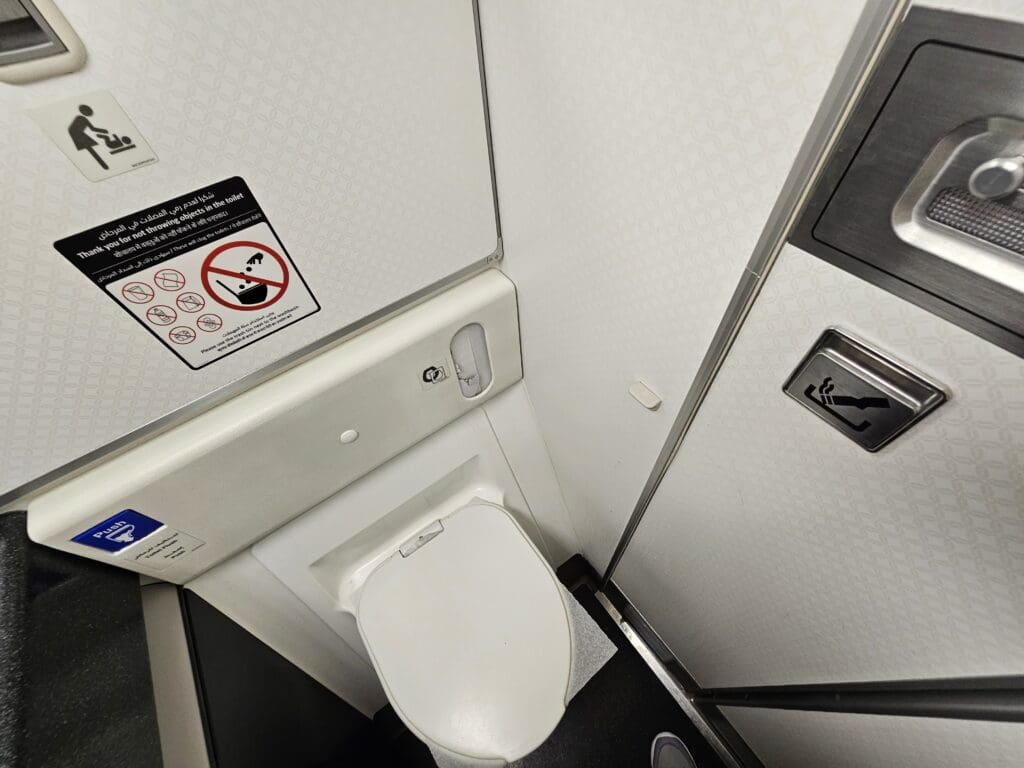 Even though Etihad Airways does not offer a Premium Economy product on any of its aircraft, the forwardmost Economy cabin is sold as ‘Economy Space’ with these seats offering slightly more legroom than their regular counterparts. As I made my way rearwards, I received several more welcomes from the friendly crew before I arrived in the rearmost cabin. Once I arrived at row 49, I stowed my bag, and, realising that I might be trapped in the window seat for some time, I decided to pay a pre-departure visit to one of the lavatories at the rear of the aircraft. Once inside, I was delighted to find this to be in a spotlessly clean condition with few noticeable signs of wear and tear.