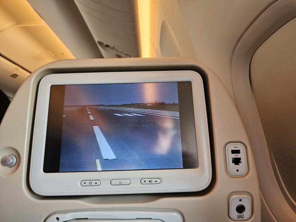 Hinting at our imminent departure, at 1024, the pre-safety video prayer took over the screens and speakers and then transformed into the safety video. Other than the fact that this was filmed in the Louvre Abu Dhabi, the safety video was relatively standard with no gimmicks or humour, yet importantly, this served its purpose and thus got no complaints from me! During our journey rearwards, the Boeing 777’s two massive General Electric GE90-115B engines powered into life, temporarily resulting in plenty of noise and vibration before things quietened down. As we commenced our taxi, the crew passed through the cabin, ensuring that all was secure for departure before the lights transformed to a sunrise/sunset yellow, or perhaps more appropriately, a desert gold. Soon leaving the satellite terminal behind, by this time, the selection of jets waiting there had changed slightly, with two new arrivals in the form of Airbus A330s – one from Air Transat and the other from Turkish Airlines. As we made our way to the runway, like a true enthusiast, I watched the forward-facing camera, which revealed there to be quite a queue of aircraft waiting to take off from Runway 25.