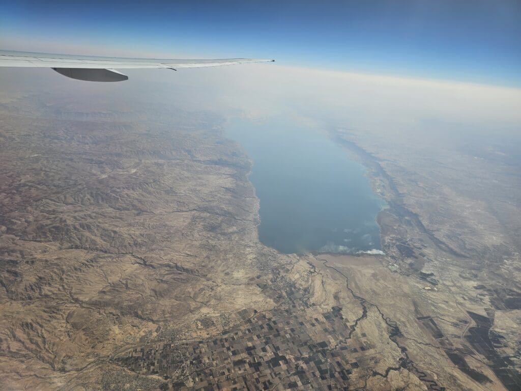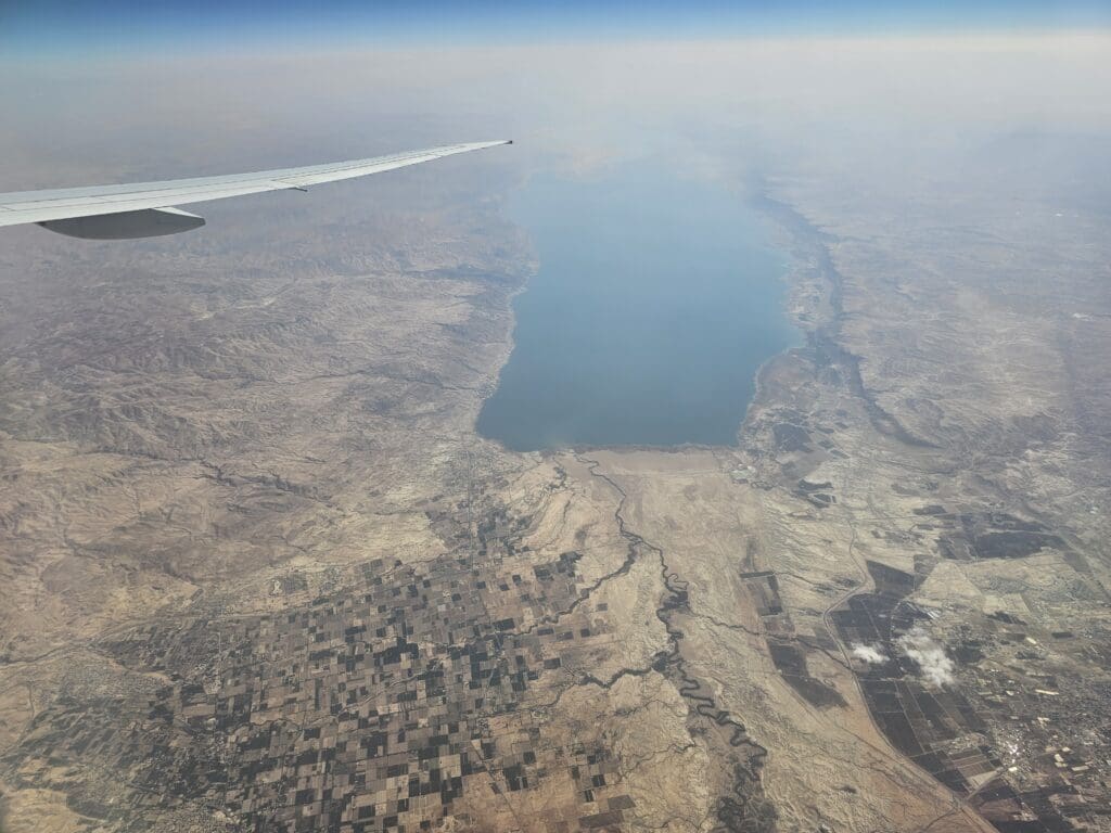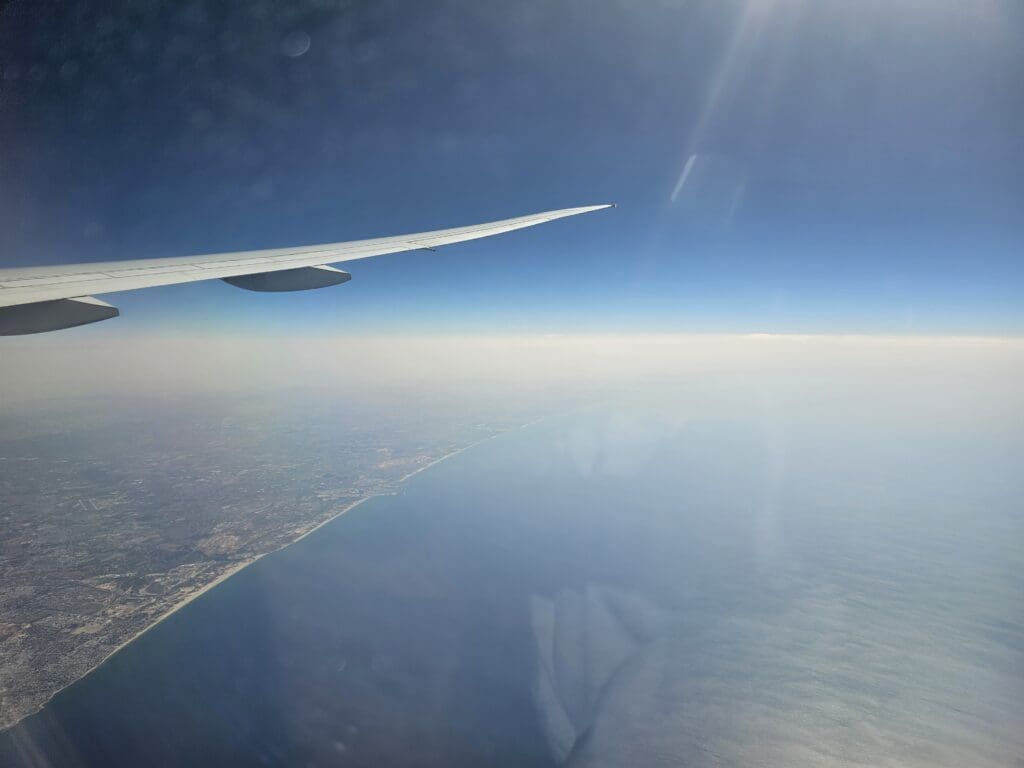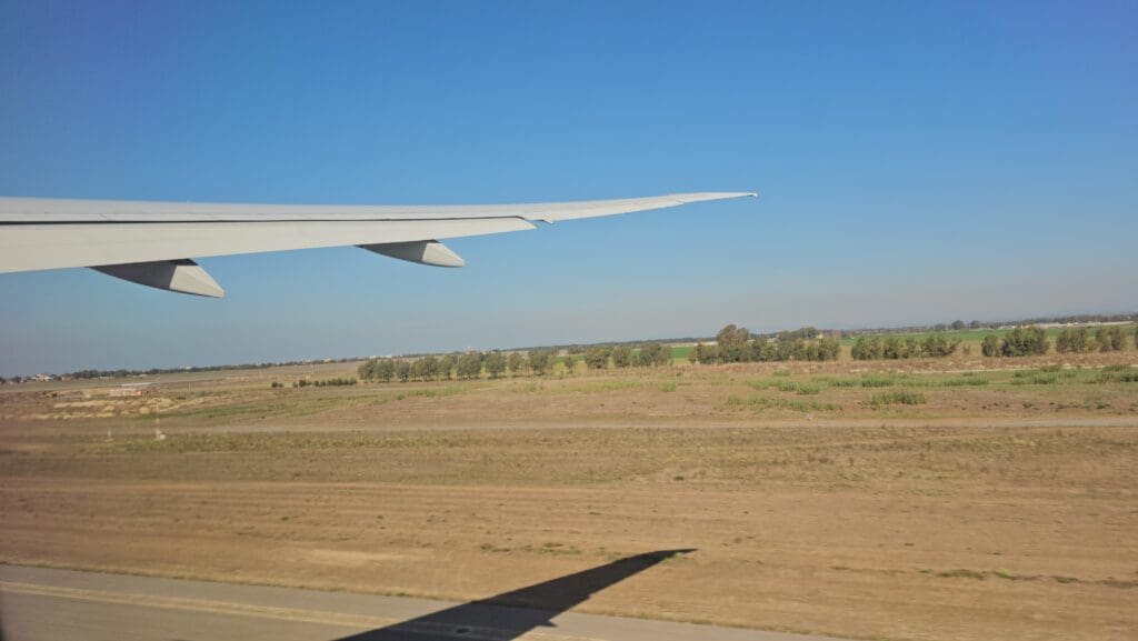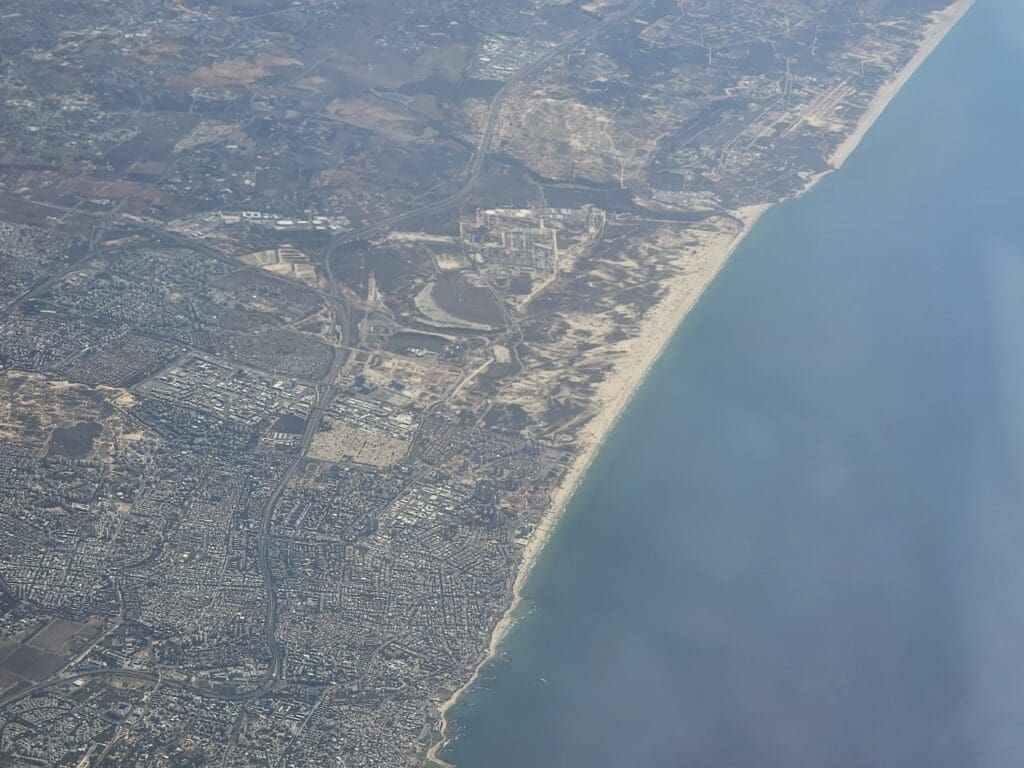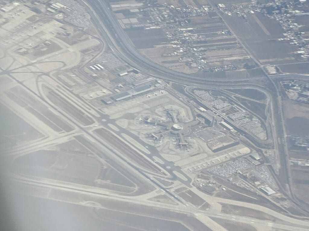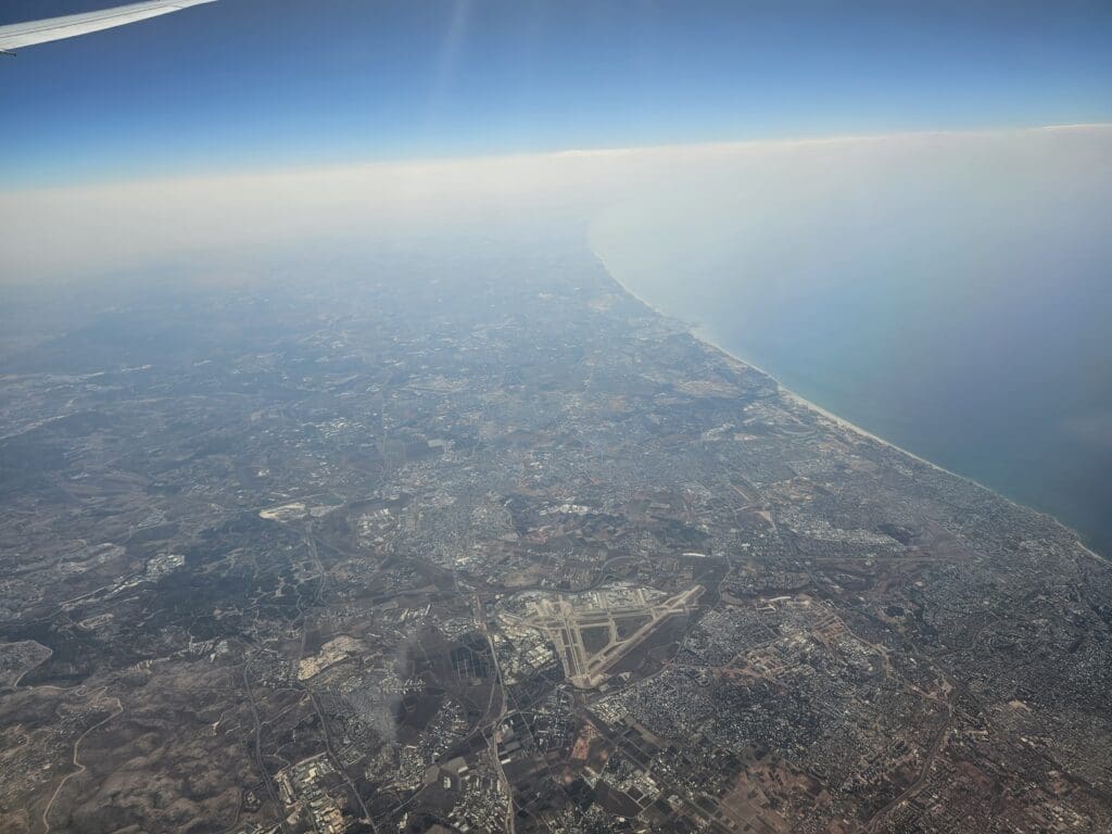 Around thirty minutes later, the flight attendant who had served me returned to collect the empty trays just before we made landfall once again. Travelling around a week before the conflict, that afternoon our flight to Abu Dhabi was to cross right over the heart of Israel, and roughly halfway into the flight, the beaches of Tel Aviv could be seen clearly outside of the window, followed a short time later by the city’s main airport. There, plenty of aircraft could be seen on the ground, both at the terminal and remote stands, before we continued heading westwards, where the hills rose as we crossed over into the skies of the West Bank. A short time later, the hills suddenly subsided and the landscape turned into a much sandier shade as we passed Jericho and the northern shoreline of the famous Dead Sea.