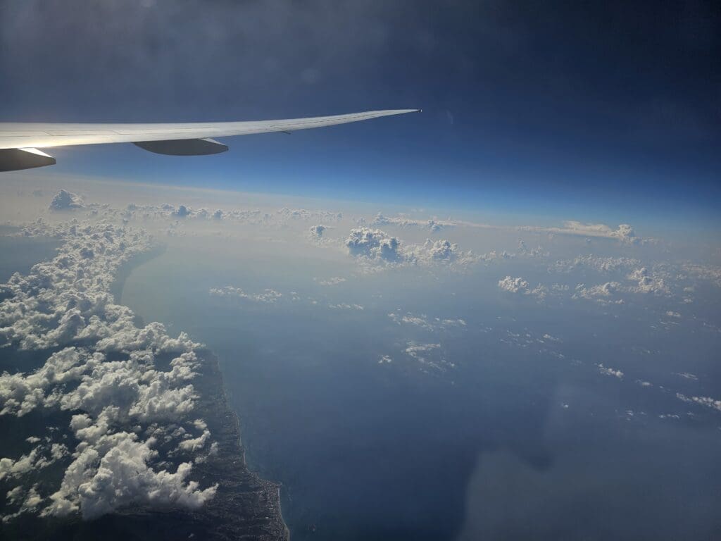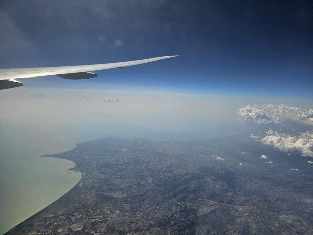 Given Rome Fiumicino’s proximity to the shoreline, it didn’t come as a surprise to find that just seconds after taking off, we passed the town of Focene and headed out over the blue waters of the Tyrrhenian Sea. From there, we soon made a gentle bank to the left, rolled out on a southeasterly heading and continued flying almost in a straight line for the duration of the flight. That morning, our departure had gone without a bump, and the seatbelt signs were extinguished as soon as we passed 10,000 feet. Sitting on the right-hand side of the aircraft, unfortunately, little could be seen during the first half hour or so of our flight. However, travelling down the west coast of Italy, those on the port side of the cabin would have been treated to superb views of famous places such as Naples, Pompei, Sorrento and the mountains of Salerno.